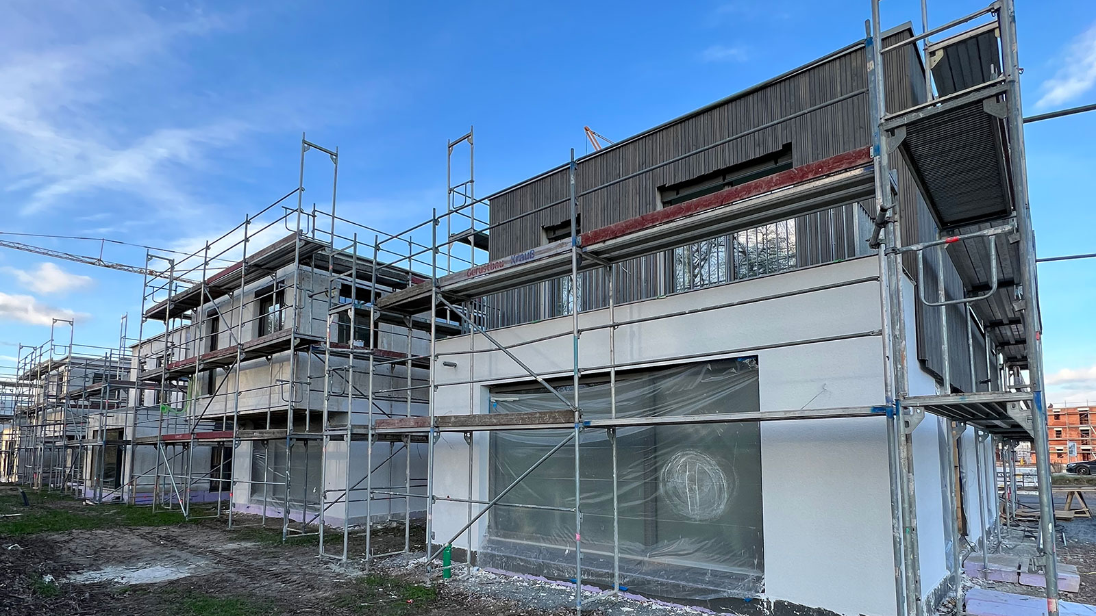 Auch wenn sich das Unternehmen aus dem Einfamilienhausbereich mehr und mehr zurückzieht, ist es weiterhin in der Quartierentwicklung und -bebauung aktiv. Auch hier werden Einfamilienhäuser gebaut, allerdings nach einem völlig anderen Geschäftsmodell. Derzeit realisiert die Materio GmbH zum Beispiel 16 Einfamilienhäuser und ein Doppelhaus im Baugebiet „Auf dem Rode“ in Lippstadt. Dabei handelt es sich um ein ehemals landwirtschaftlich genutztes Areal, dass die Stadt 2017 in Bauland umgewandelt hat, um der Wohnungsknappheit in der industriell gut erschlossenen Region entgegenzuwirken. Für einen kleinen Bereich dieses Areals lobte die Gemeinnützige Wohnungsbaugesellschaft Lippstadt 2020 einen Architekten- und Investorenwettbewerb aus, an dem sich die Materio GmbH zusammen mit ihrem Kooperationspartner Rinsdorf Ströcker Architekten (RSA) beteiligte. Ziel des Wettbewerbs war es, diese Teilfläche des Bebauungsplans durch regionale Unternehmen mit flächen- und energiesparenden Gebäuden zu bebauen. Zu den Zielvorgaben gehörten außerdem die Konzeption nachhaltiger, kostengünstiger und flexibler Gebäude mit hoher Wohnqualität, attraktivem Erscheinungsbild und Freibereichen auf den Grundstücken.