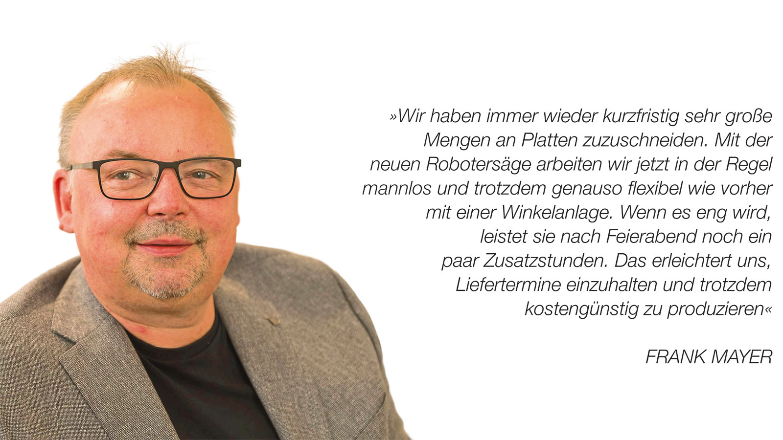 »Wir haben immer wieder kurzfristig sehr große Mengen an Platten zuzuschneiden. Mit der neuen Robotersäge arbeiten wir jetzt in der Regel mannlos und trotzdem genauso flexibel wie vorher mit einer Winkelanlage. Wenn es eng wird, leistet sie nach Feierabend noch ein paar Zusatzstunden. Das erleichtert uns, Liefertermine einzuhalten und trotzdem kostengünstig zu produzieren«