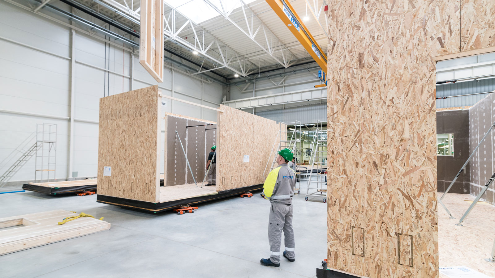 Hier werden sie sofort auf Wagen gesetzt und ausnivelliert, damit die Module beim Zusammenbau absolut im Lot stehen. Anschließend werden die Raumzellen zusammengebaut. Dabei werden sie nicht über Schienen, sondern auf Wagen von Station zu Station bewegt. MOD21-Geschäftsführer Theodor Kaczmarczyk: „Das gibt uns mehr Flexibilität, weil wir die Module auch drehen, diagonal bewegen und je nach Breite in unterschiedlichen Stückzahlen nebeneinander anordnen können. Wenn es einen Engpass gibt, kann ein fertiges Modul auch mal ein noch in Arbeit befindliches überholen.“ Wandelemente werden in einem Takt von 29 Minuten produziert, Boden- und Deckenelemente brauchen 59 Minuten – eine Differenz, die vor allem aus dem höheren Anteil an manuellen Arbeitsgängen resultiert: In den Böden gibt es schräge Verbindungen zwischen den Konstruktionshölzern, die bislang noch manuell geschossen werden. In der Elementfertigung arbeiten derzeit zwölf Mitarbeiter. Raumzellen sind – die Fertigung der Elemente eingeschlossen – nach zwei Tagen fertig. Der Innenausbau benötigt weiter 12 Tage, so dass der Gesamttakt für ein fertiges Modul bei 14 Tagen liegt – inklusive fertiger Installation, Einbauschränken, Küchen und Sanitärobjekten bis hin zur Toilettenbürste im Wandhalter. Dabei arbeitet MOD21 überwiegend mit eigenen Mitarbeitern und setzt nur bei einzelnen Gewerken wie Dach und Fassade, die Nacharbeit auf der Baustelle erfordern, externe Handwerker ein. Der Vorteil: Die Zeit- und Kostenvorteile der in der Halle erbrachten Handwerkerleistungen fließen in die Gesamtkalkulation mit ein. Externe Handwerker sind dagegen noch nicht bereit, diese Vorteile in ihre Leistungen einzupreisen.