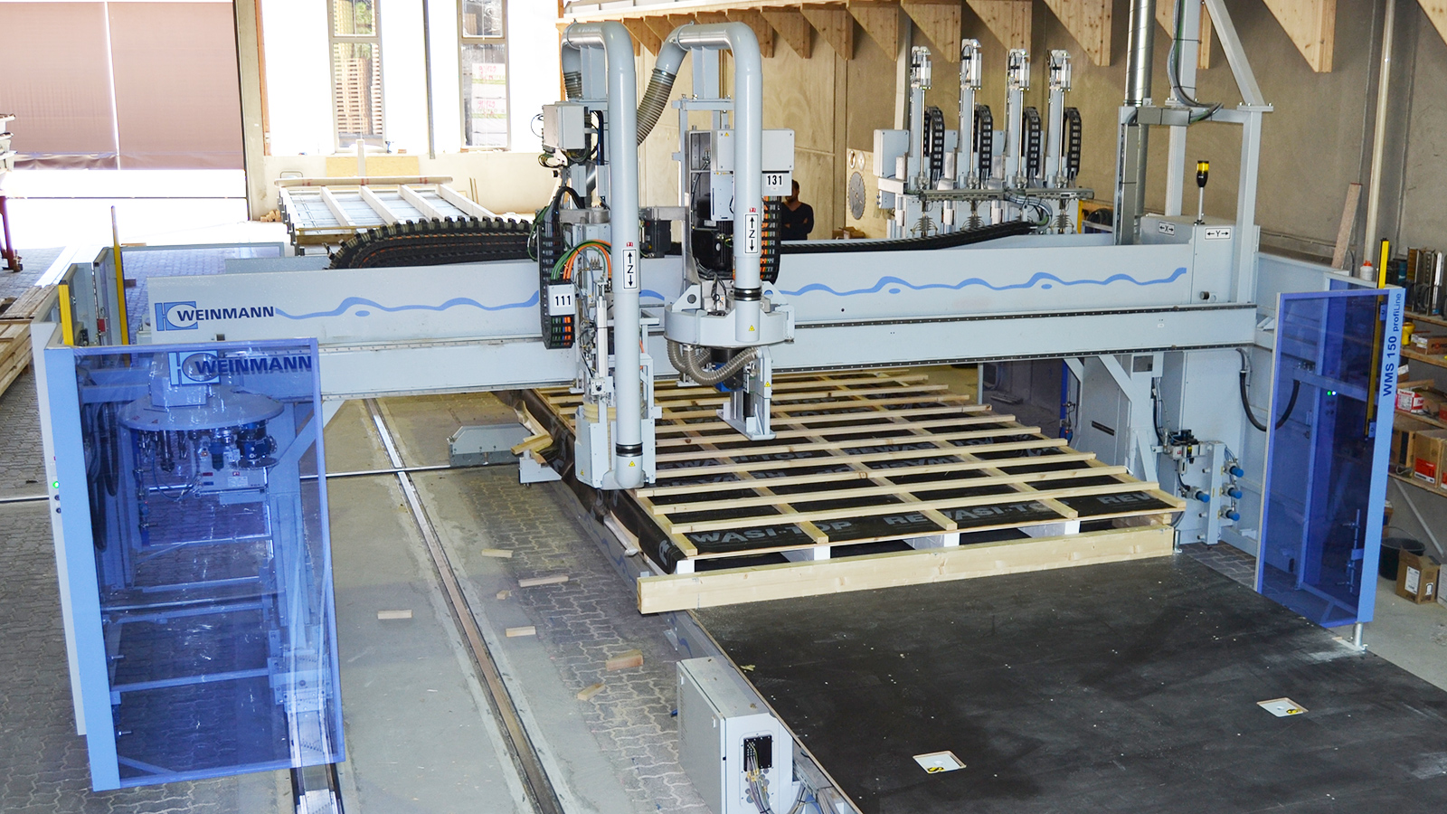 Daneben ist die individuell konfigurierbare WMS 150 der Zimmerei mit drei Nagel- und Klammergeräten, einem Inkjet-Beschrifter und der üblichen 18,5 kW Werkzeugspindel mit 12fach-Werkzeugwechsler ausgestattet. Eine Multifuktionsbrücke mit Vollausstattung, mit der man gut für die Zukunft aufgestellt ist.