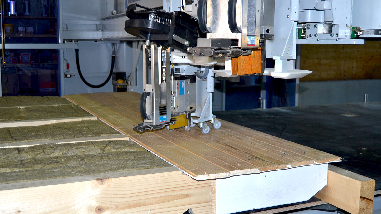 Letzteres heißt nicht nur, dass er seine Wandelemente mit oder ohne Installationsebene liefert und dass die Dämmstärken und -materialien variieren. Hin und wieder verlässt der Zimmerer auch den Bereich der Holzrahmenkonstruktionen und baut mit TJI-Trägern oder mit Brettsperrholzelementen, die auf der Baustelle mit einer Außendämmung versehen werden. Bei einem Projekt fräste die WMS 150 OSB-Platten für eine Rohbau-Schalung, bei einem anderen formatierte sie Dreischichtplatten und versah sie mit mehreren Nuten, bevor sie per Container als Dachschalung nach Singapur gingen.