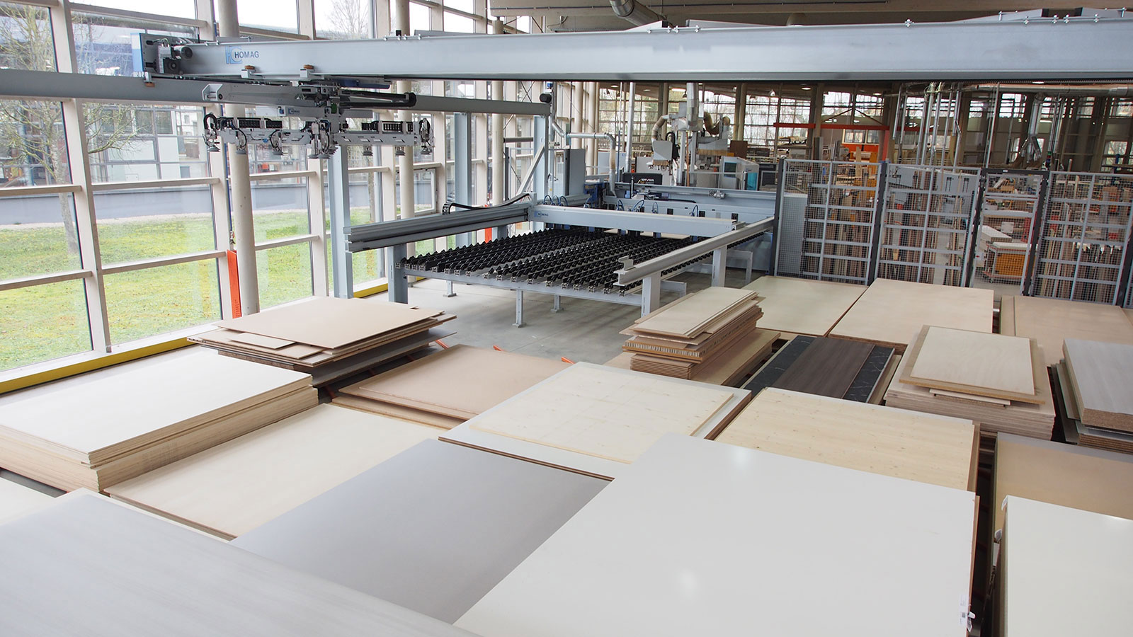 Jüngste Investition ist eine neue Säge-Lager-Kombination, ebenfalls von Homag. Dabei arbeiten eine Plattenaufteilsäge HPP 300 und das Lager STORETEQ S-500 (TLF 411 samt Saugtraverse ST 71 im automatisierten Verbund – Restelager und -verwaltung inklusive. Die Säge verfügt über einen bedüsten Maschinentisch. Die Option DustEx sorgt für einen stets sauberen Arbeitsbereich auf der Säge, wodurch die Plattenoberflächen vor Kratzern geschützt werden. Für druck empfindliches Material lassen sich die Spannzangen gesondert einstellen. Die Saugtraverse kann Platten bis 5600 mm Länge und bis 350 kg Gewicht hand haben. Die mögliche Stapelhöhe im Lager beträgt 2500 mm. Dank einer Zusatzfunktion in der Lagersoftware können z. B. lichtempfindliche Platten automatisch mit einer Lichtschutzplatte abgedeckt werden, um Farbveränderungen durch Sonneneinstrahlung zu vermeiden. Die Säge verfügt über pneumatische Besäumanschläge sowie eine automatische Winkelschnittfunktion. Weitere Funktionen: Nuten, Ausschnitte und Postforming. Etikettiert wird automatisch am Druckbalken. Zusätzlich ist eine manuelle Etikettierung installiert. Die Optimierungssoftware Schnitt Profit kann der Sägensteuerung wahlweise Rohzuschnittoder auch Fertigteilmaße übergeben. Das Softwaretool „WoodStore Analyzer Expert“ analysiert auf Wunsch die Hauptfunktionen des Lagers über einen definierten Zeitraum und gibt Hinweise, an welcher Stelle Verbesserungsbedarf besteht. Das Expertensystem gibt auch gleich konkrete Tipps, welche Schritte dazu eingeleitet werden können.