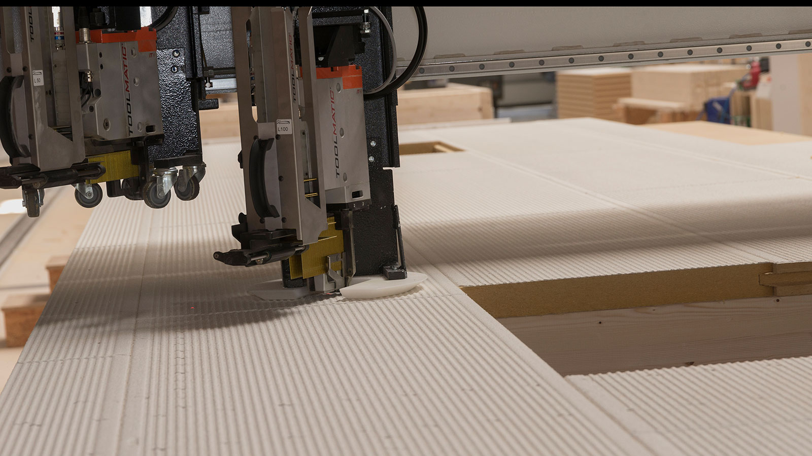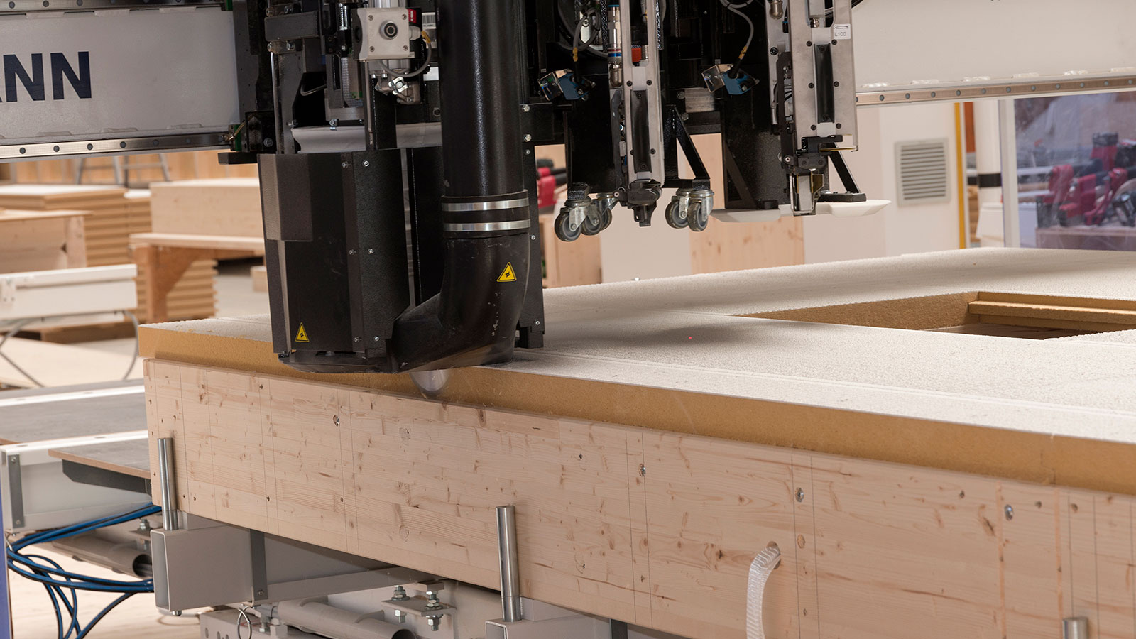 Ein Geschäftsfeld, das sich in den letzten Jahren so positiv entwickelte, dass man angesichts der angespannten Personalsituation in eine automatisierte Elementfertigung investierte. Das anhaltende Hoch im Holzbau hat in vielen Abbundzentren zu einem strukturellen Wandel geführt: Unter dem Eindruck einer stetig steigenden Nachfrage nach vorkonfektionierten Holzbauelementen ist ein Großteil dieser traditionell auf hohem technischem Niveau produzierenden Zulieferer dazu übergegangen, zusätzlich zum Stababbund fertige Wand-, Dach- und Deckenelemente anzubieten. Den Kunden, oft kleinen Zimmereien ohne eigene Produktionskapazität, bietet dieser zusätzliche Service einen vergleichsweise risikolosen Einstieg in den Holzbau: Ohne Investitionen in Gebäude, Manpower oder Maschinen haben sie die Sicherheit, dass die von ihnen in Auftrag gegebenen Elemente in professioneller Qualität just in time auf der Baustelle sind. Dass die Abbundzentren bei stabiler Nachfrage auf lange Sicht auch den Bereich der Elementfertigung automatisieren würden, war bereits zu Beginn dieses Strukturwandels zu erwarten. Inzwischen ist dieser Automatisierungsprozess bereits seit einigen Jahren in vollem Gang – zum Nutzen aller Beteiligten.
