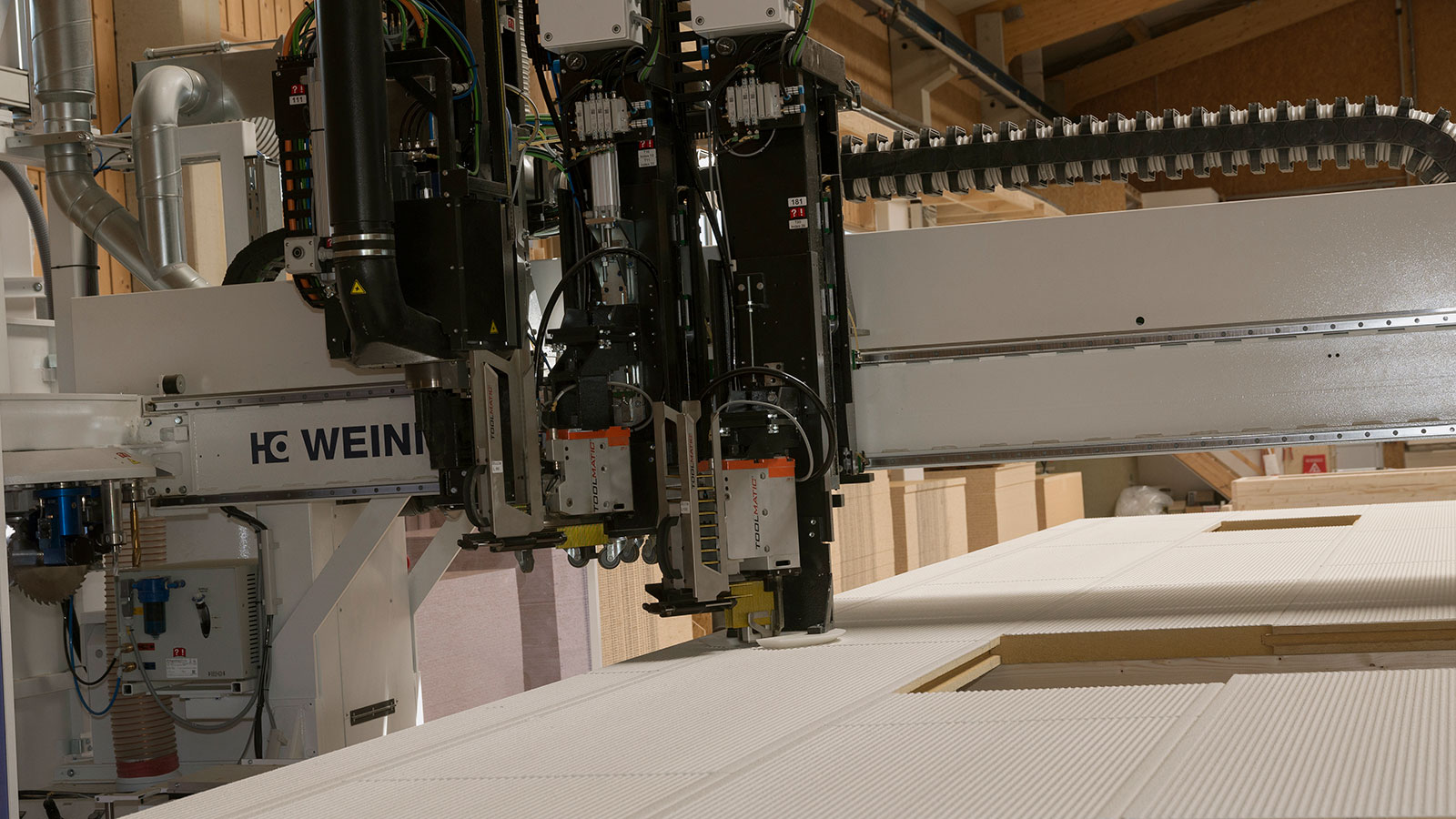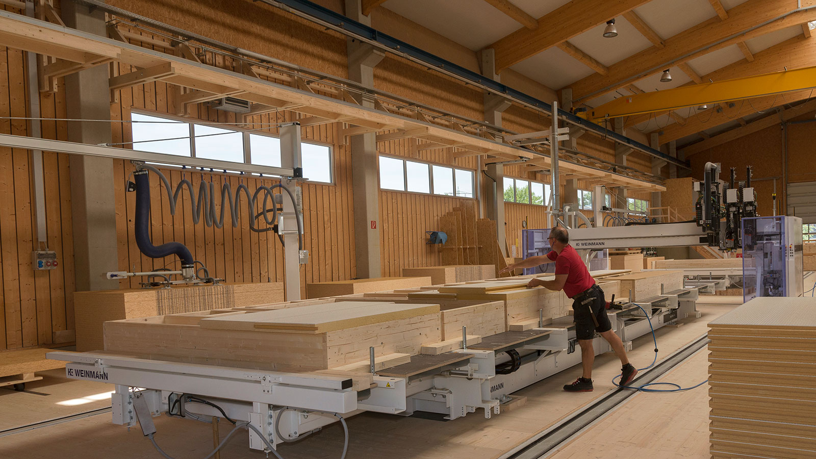 Da auch auf dem prekären Arbeitsmarkt kein Fachpersonal zu bekommen war, fasste man in Heiligenberg die Investition in eine automatisierte Fertigung ins Auge. „Wir haben zunächst im Internet recherchiert und verschiedene Alternativen geprüft. Dabei schälte sich ziemlich schnell die Firma WEINMANN als Favorit heraus, weil wir kurze Ersatzteilwege bevorzugen und weil dieses Unternehmen uns eine Lösung ganz nach unseren Bedürfnissen bieten konnte. Das erfuhren wir in intensiven Gesprächen beim WEINMANN-Treff, am Messestand und bei Kundenbesuchen.“ Einer der Referenzkunden arbeitete mit einer Multifunktionsbrücke WALLTEQ M-340, die ihm mit 12-fach Werkzeugwechsler und einer separaten Pick-up Station für ein Sägeblatt eine extreme Flexibilität bot – exakt passend zum Anforderungsprofil des AZ Bodenseekreis. Das umfasst eine breite Palette an Wandaufbauten und Materialien: „Wir sind hier sehr individuell aufgestellt, jeder Kunde ist anders, einer will zum Beispiel nur geschlossene Wände, der andere offene mit einseitiger OSB-Beplankung. Das war bei diesem Kunden genauso, und er bereute eigentlich nur, dass er zunächst in eine kleinere Linie investiert hatte.“ Um die Flexibilität weiter zu erhöhen, orderte man in Heiligenberg zusätzlich zur WALLTEQ M-340 zwei Zimmermeistertische, die mit Dach- und Deckenspannern ausgestattet sind. Man wollte neben Wänden auch Dach- und Deckenelemente fertigen. „Für WEINMANN kein Problem, das ist in Lonsingen Routine.“ Zum Leistungsumfang des Maschinenbauers gehörte auch eine Optimierung des Hallenworkflows, in deren Rahmen sich ein WEINMANN-Berater über zwei Tage intensiv mit den Mitarbeitern in der Fertigung austauschte. „Da ging es darum, wie wir hier arbeiten, wie man die Beschickung der Tische und den Abtransport der Elemente optimal organisieren oder welchen Arbeitsschritt man am besten an welchem Tisch machen könnte.“ So entstand Schritt für Schritt eine flexible Lösung mit Materiallagern vor und hinter den Tischen, was an jedem Tisch den Zugriff auf alle Materialien ermöglicht. Die Tische sind Aufstell- aber keine Wendetische. Das bringt dem Abbundzentrum mehr Flexibilität, etwa wenn einseitig beplankte Elemente auf zwei Tischen gleichzeitig gefertigt werden. Wird gewendet, erfolgt der Transport von Tisch zu Tisch mit dem Hallenkran. Die Beratung durch WEINMANN bezeichnet Manfred Fritz im Rückblick als „exzellent. Man riet uns zum Beispiel explizit von einem Wendetisch ab, obwohl man daran mehr verdient hätte.“ Auch bei der Inbetriebnahme der neuen Anlage fühlte sich der Geschäftsführer „hervorragend betreut, der Wechsel von manueller zu automatisierter Fertigung lief nahtlos und ohne Produktionsunterbrechungen. Der Berater kam aus dem Holzbau und gibt uns bis heute Tipps zur Arbeitsvorbereitung, die für uns Gold wert sind.“