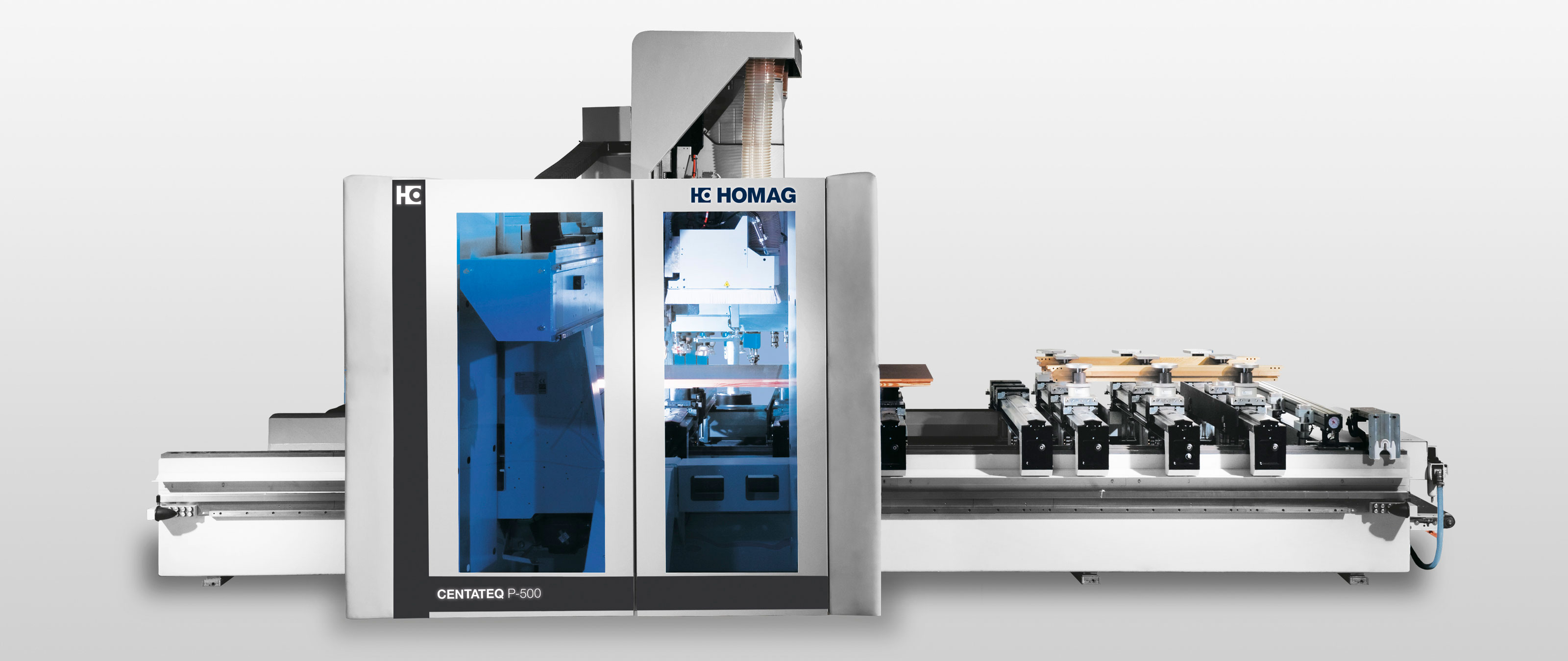 Um der Individualität Rechnung zur tragen und trotzdem eine industrielle Fertigung zu ermöglichen, hat HOMAG als Ergänzung für die Fertigbearbeitung in der Türenfertigung eine CNC-Stationärzelle für die Finalisierung von Türblättern entwickelt, deren Herzstück eine CENTATEQ P-500 bildet. Sie wird automatisch von einem Roboter beschickt, der in X-, Y-Achse verfährt.