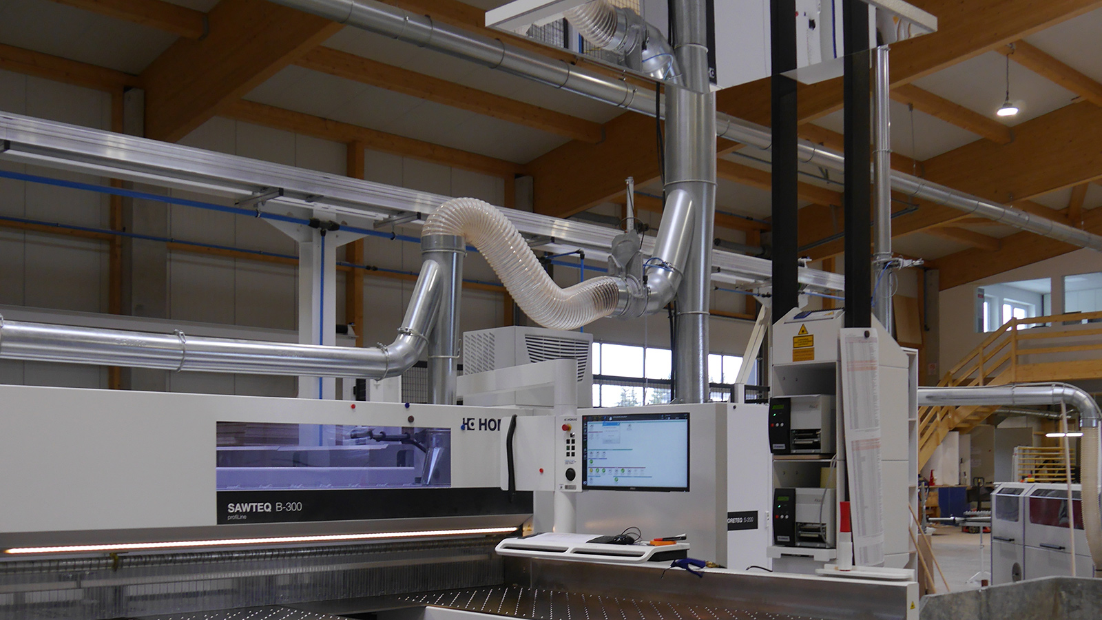 „Mindestens ebenso wichtig wie die neuen Maschinen war für uns das Ziel, einen durchgängigen Daten-, Material- und Informationsfluss zu gestalten: von der Planung und Arbeitsvorbereitung über alle Bearbeitungsstationen bis hin zur Montage auf der Baustelle“, berichtet Weng. Neben einer geeigneten IT- und Software-Architektur braucht es dafür vor allem eine durchdachte Kennzeichnungsstrategie: Sämtliche Teile müssen direkt nach dem Zuschnitt mit maschinenlesbaren Informationen für die weiteren Bearbeitungsschritte ausgezeichnet werden.