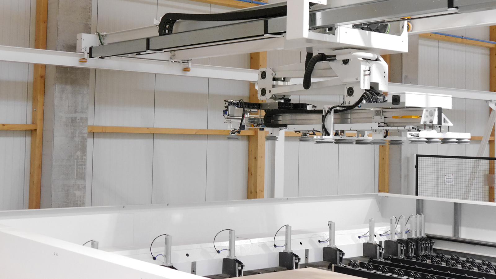 Es beschickt abwechselnd sowohl die Säge SAWTEQ B-300 als auch das Bohrzentrum DRILLTEQ H-600 mit Rohplatten beziehungsweise Teilen. Der grobe Ablauf: Um eine große Plattenvielfalt anbieten und stets genug Material zur Hand zu haben, hält das Unternehmen ständig Rohplatten in ausreichender Menge vorrätig. Viele davon liegen in einem Außenlager. Wird Nachschub benötigt, holt ein Teammitglied diesen per Gabelstapler und stellt die Platten palettenweise auf den Einlagerplatz des STORETEQ S-200. Das Einlagern selbst erfolgt vollautomatisch. Dafür ist das Lager mit einer kraftvollen Saugtraverse ausgestattet.