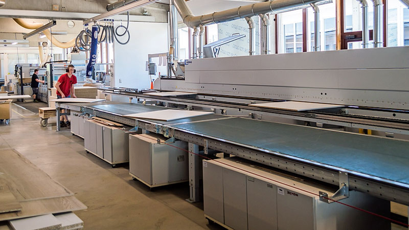 Vor der Investition in die Säge-Lager-Kombination diente etwa die Hälfte der Maschinenhalle als liegendes Plattenlager. Der Sägenführer hatte alles im Blick und kümmerte sich mit dem Gabelstapler selbst um die Materialversorgung. Das funktionierte eigentlich ganz gut, solange der Mann nicht krank oder im Urlaub war. Die Schreinerei nutzte die Chance, den Engpass zu beseitigen und das Lager so zu automatisieren, dass jetzt jeder damit zurechtkommt. Die durch das angebaute Flächenlager frei gewordenen Flächen haben die Verdoppelung des Durchsatzes erleichtert. Neben der Säge-Lager-Kombination betreibt die Schreinerei auch noch die Kantenanleimmaschine EDGETEQ S-500 mit Rückführung, das vertikale Bearbeitungszentrum DRILLTEQ V-500 (BHX 200) sowie für das Nesting die CENTATEQ N-500 (BHP Vantage).
