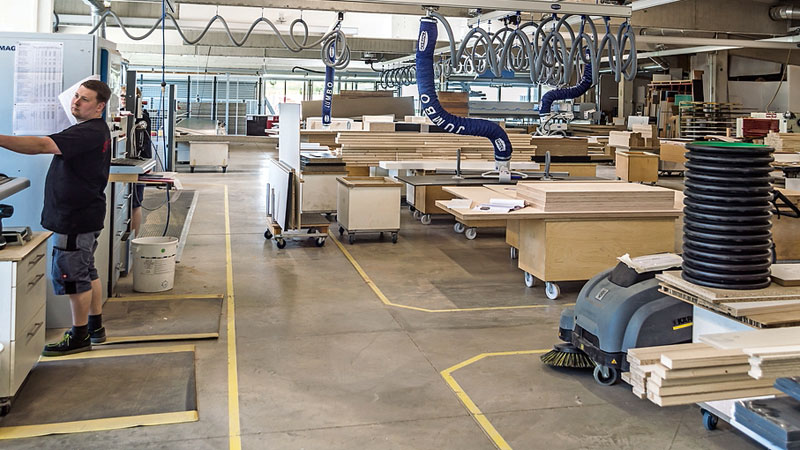 Thomas Schuhmann gründete vor 20 Jahren, nachdem er zuvor in Würzburg mehrere Jahre bei einem großen Ladenbauer tätig gewesen war, den Betrieb als Einmannschreinerei. Heute beschäftigt er in zwei Produktionshallen und einem Bürogebäude mit insgesamt 5.000 m2 30 Mitarbeiter. Sechs Kollegen und Kolleginnen erledigen mit Imos die Arbeitsvorbereitung, sechs kümmern sich um die Verwaltung und den Vertrieb, 15 arbeiten in der Werkstatt und fünf sind im Montagetrupp unterwegs.