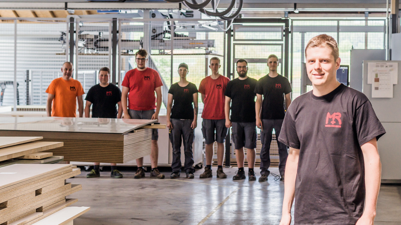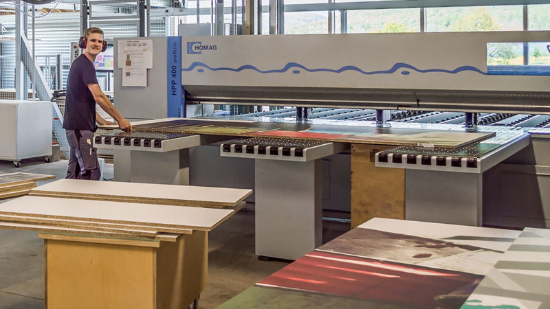 Dass er mit einer verhältnismäßig geringen Investition quasi über Nacht soviel erreichen konnte, verdankt er zwei seiner wesentlichen Grundüberzeugungen: Zum einen hat er regelmäßig in Maschinen, IT und Qualifizierung seiner Mitarbeiter investiert, zum anderen gleichzeitig vor allem die jungen Nachwuchskräfte gefördert und an das Unternehmen gebunden. Thomas Schuhmann sagt: »Was die Technik angeht, vertraue ich ganz auf Karl-Heinz Brauneisen von HOMAG. Wenn heute ein Sechzehnjähriger mit seinen Eltern zu mir kommt, biete ich ihm eine Perspektive, die oft weit über seine Erwartung hinausgeht. Viele nehmen das gerne an und entwickeln sich zu treuen und sehr kompetenten Mitarbeitern. Die Technik spielt dabei eine wichtige Rolle, weil zum einen die Nachwuchskräfte sich dafür begeistern und zum anderen IT und moderne Maschinensteuerungen die noch fehlende Erfahrung gut kompensieren können. Fabian Eckstein zum Beispiel ist heute 27 Jahre alt, hat bei mir gelernt, von hier aus das duale Studium zum Holztechniker in Mosbach absolviert und ist bereits seit zwei Jahren mein Betriebsleiter. Er hat die aktuellen Produktionsaufträge im Blick und kümmert sich um die IT und um die Technik. So hat er auch die Kombination der Plattenaufteilsäge SAWTEQ B-400 (HPP 400) mit dem Flächenlager STORETEQ S-200 (TLF 211) von HOMAG im eigens dafür errichteten Anbau konzipiert, sich mit der Zahl der Lagerplätze, der Softwareanbindung, den Etiketten und den Betriebsabläufen befasst und alles zum Laufen gebracht.«