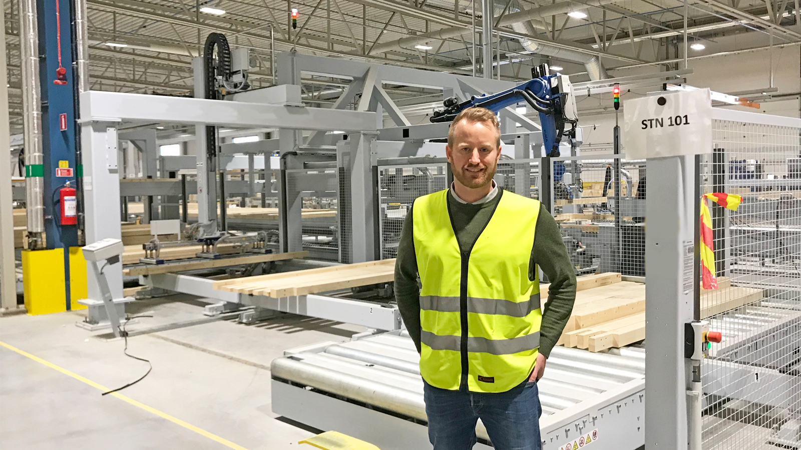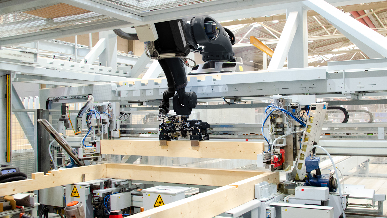 Ola: Integriert in die Riegelwerkstation, ist der Roboter zuständig für den Einbau der Stiele in das Riegelwerk. Der Roboter legt diese vollautomatisch in das Riegelwerk ein und stellt so ein Wandelement in nur 7 Minuten her. Der Roboter - und auch das Handlingportal - vereinfacht die gesamte Logistik und bietet unseren Mitarbeitern ein ergonomisches Arbeitsumfeld. Zudem bietet das System eine hohe Arbeitssicherheit. Ich bin überzeugt davon, dass Roboter zukünftig vermehrt in der Vorfertigung eingesetzt werden.