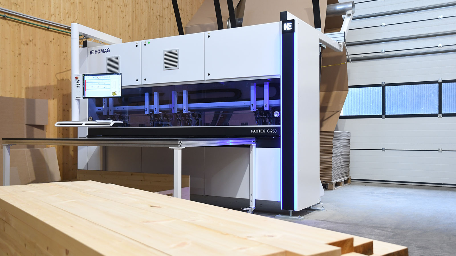 Anders als früher, als mit der alten Plattensäge auch Pfosten zugeschnitten wurden, übernimmt die SAWTEQ S-200 seit Anfang des Jahres allein den Zuschnitt von Massiv- und Sperrholz. Da bei wurde ihre Größe so gewählt, dass sich später auch noch ein liegendes Lager installieren lässt. Die zugeschnittenen Teile durchlaufen mit Etikettierung alle nachfolgenden Stationen und müssen hier nur noch abgescannt werden.