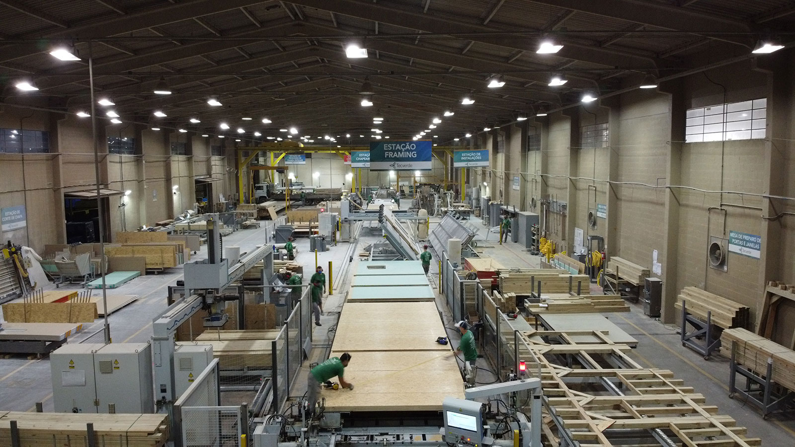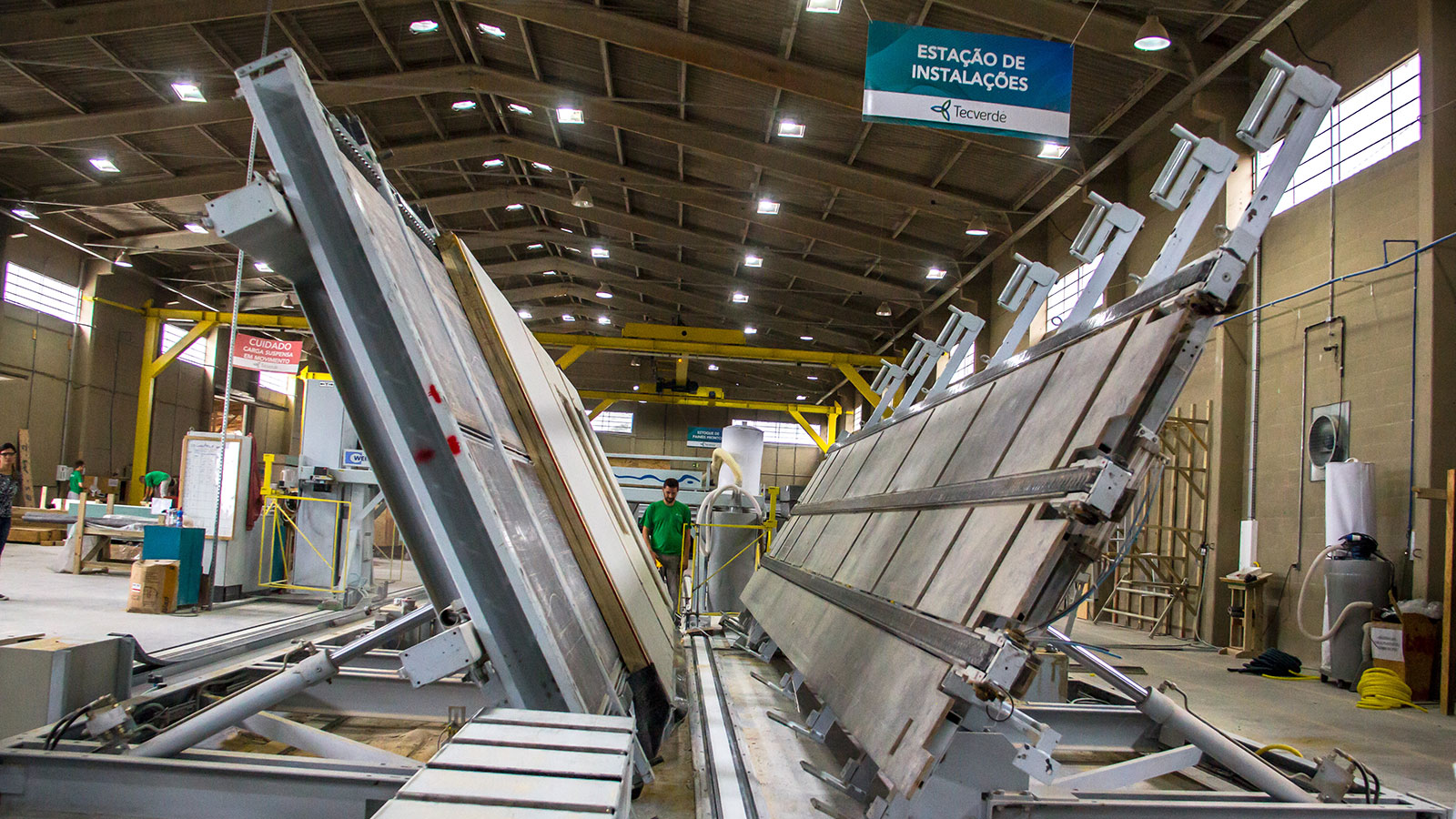 So erfolgte die Definition durch das Leichtholzrahmensystem, wobei der Stand der Technik des Bausystems und der Entwicklungsprozess zur Anpassung an den brasilianischen Markt in Tests und Zulassung der Technologie erforscht wurden. Ramon: „Die Vorfertigungstechnologie für leichte Holzrahmen ermöglicht die Annahme einer Industrialisierungsdenkweise, die einige der Hauptprobleme traditioneller Bausysteme angeht. Durch die Produktion in einer kontrollierten Umgebung, mit Unterstützung einer automatisierten Produktionslinie, ist es möglich, Qualitäts-, Sicherheits- und Produktivitätsniveaus zu erreichen, die die Effizienz des Bauprozesses steigern. Die Eliminierung dieser inhärenten Ineffizienzen, die in traditionellen Bausystemen verwurzelt sind, ermöglicht es, dem Endkunden ein Produkt mit besserer Leistung und eingebetteter Technologie schneller und zu geringeren Kosten anzubieten.“ Die Fabrik von Tecverde verfügt über einen speziellen Bereich für die Holzverarbeitung. Hier werden Holz und Platten geschnitten, zusätzlich zur Vormontage von Elektro-, Sanitär- und Fensterrahmen, aus denen die Wandplatten, Böden, Dachkonstruktionen und andere Elemente bestehen.