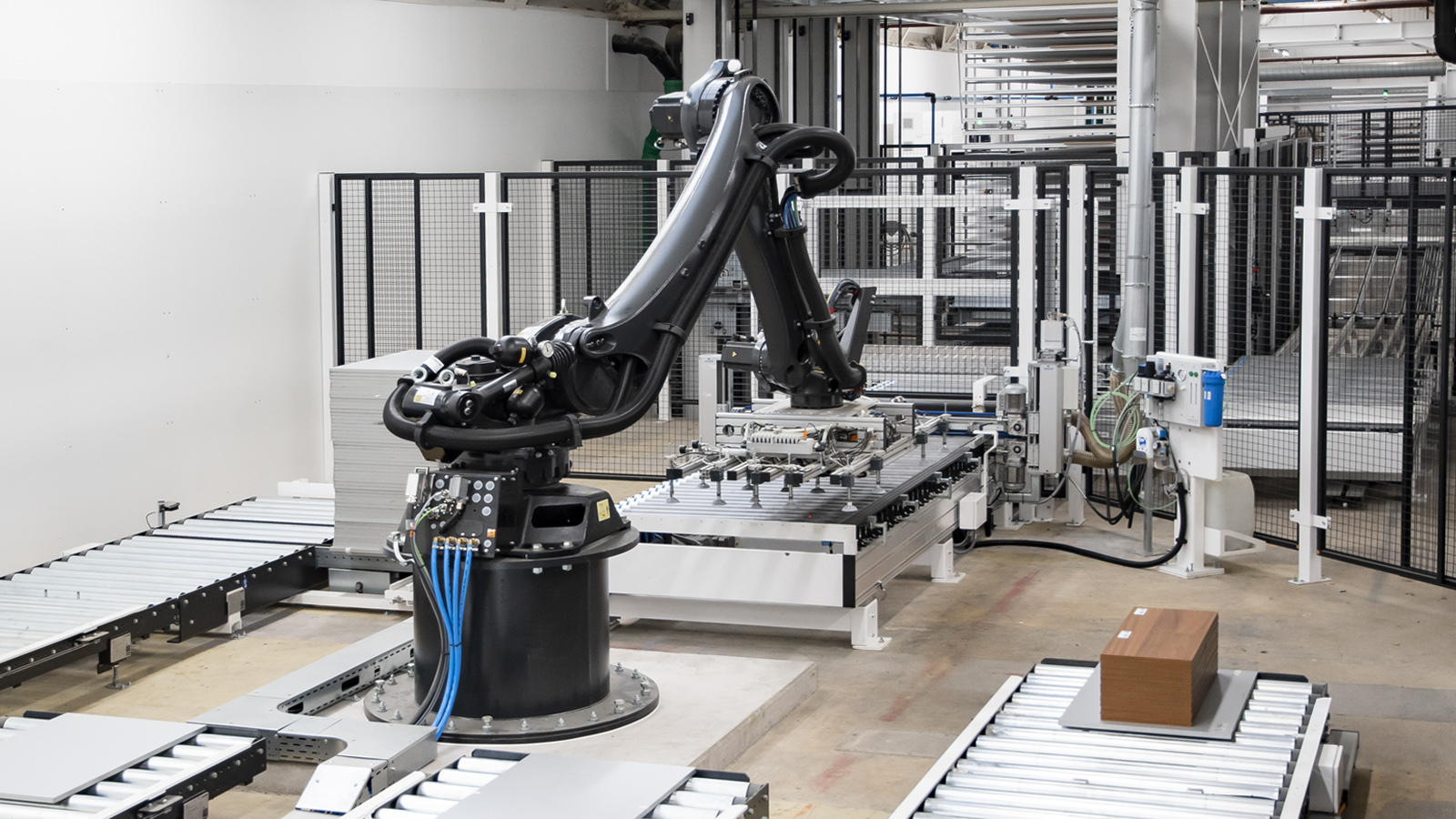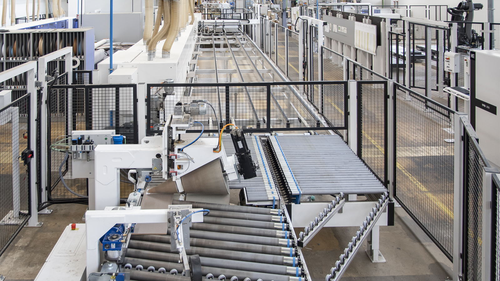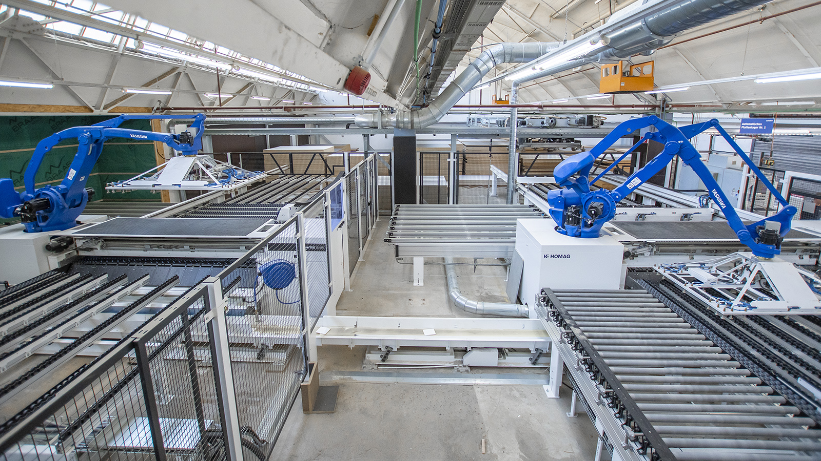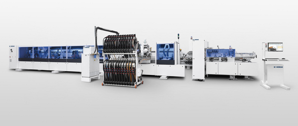 In der industriell organisierten Fertigung in Schenkenzell sind weite Teile der Produktion automatisiert. Auf einer vollverketteten, per Leitsystem ControllerMES vernetzten Anlage von HOMAG wird variabel bis Losgröße 1 gefertigt. ControllerMES übernimmt dafür die Kunden- und Fertigungsaufträge aus dem Planungssystem von Duravit und spielt die Daten an die einzelnen Bearbeitungsmaschinen. Startpunkt des hochflexiblen Fertigungsprozesses ist ein Flächenlager, in das Plattenwerkstoffe computergesteuert eingelagert werden. Ein Lager das in der heutigen Generation einem STORETEQ S-500 entspricht, versorgt zwei Sägen SAWTEQ B-320 flexTec mit den Rohplatten. Das Flächenlager übernimmt damit das Einlagern und Sortieren sowie das Auslagern an den Sägen, die als Aufteilzellen für den individuellen Zuschnitt von Einzelplatten und die auftragsbezogene Fertigung ausgelegt sind. Von der Fertigungssteuerung werden die Kundenaufträge nach Materialart gebündelt, um möglichst wenig Verschnitt zu erzeugen. Nach Abarbeitung der zugehörigen Schnittpläne auf den SAWTEQ B-320 flexTec laufen die Teile, die nicht bekantet werden müssen, direkt zur Abstapelung. Bauteile, die eine Kante erhalten sollen, werden in einem Lagenspeicher SORTEQ H-600, der als Entkopplungspuffer fungiert, zwischengepuffert und über einen Zwischentransport bedarfsgerecht einer Kantenbearbeitungsmaschine EDGETEQ S-800 zugeführt. Konzipiert für die kommissionsweise Fertigung, arbeitet die Maschine breitenunabhängig und lässt sich demzufolge flexibel nutzen. Mit einem Kantenumlauf LOOPTEQ C-500 ist die Kantenlinie als O-Straße ausgeführt, in der die Bauteile über zwei Umläufe final beschichtet werden. Nach der Bekantung gehen die Bauteile in einen 4-fach-Sortierer TLB 210 oder direkt zur Abstapelung. Der Stapelbahnhof mit Roboterabstapelung stellt hier die Auslagerung der Bauteile eines Sortierloses in der vorgegebenen Reihenfolge sicher.