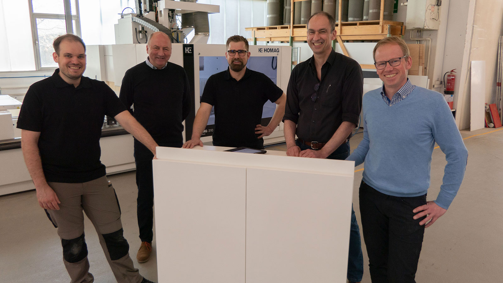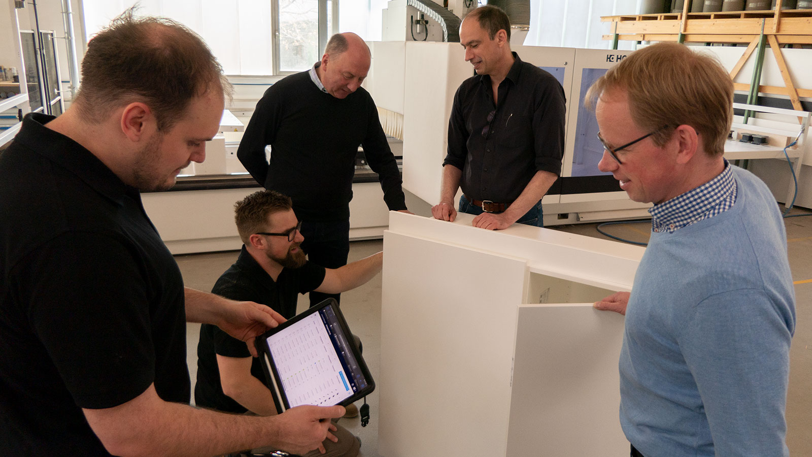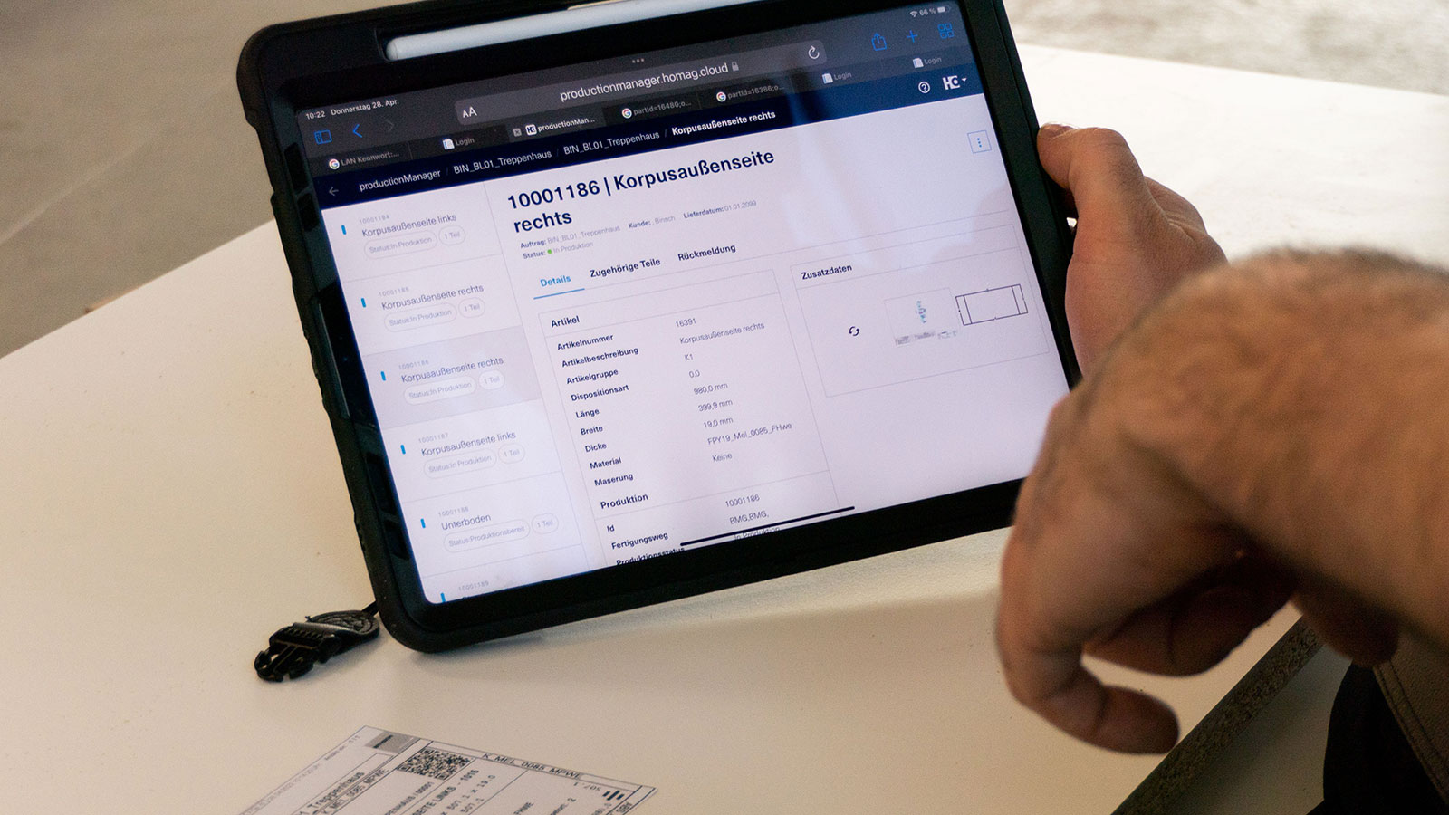 Binsch ist Pilotkunde für den productionManager von HOMAG. Schritt für Schritt wurden die Stationen definiert, an denen für jedes Bauteil eine Rückmeldung in die App erfolgt: Säge, Kante, CNC-Bearbeitung und Auslieferung bis hin zur Montage. Julian Roob: „Jedes Bauteil erhält einen Barcode, kombiniert aus Auftragsname und Bauteilnummer. Den kann man sowohl mit iX Scout als auch mit dem productionManager scannen. Beim productionManager erfolgt eine Rückmeldung, dass das Bauteil eine Station passiert hat.“ Für den Test wurde bei Binsch ein kleines Möbel mit iX CAD konstruiert. Nach der Übergabe an iX Scout werden daraus die Daten für den productionManager generiert und der Testlauf gestartet. Erstes Fazit: „Die zwei Produkte ergänzen sich super“, so Benjamin Goldschmid. „Die zwei digitalen Lösungen passen sehr gut zusammen. Im Vordergrund steht die papierlose Produktion. Ein wichtiger Vorteil der beiden Apps ist, dass immer alles komplett digital vorhanden und aktuell ist.“