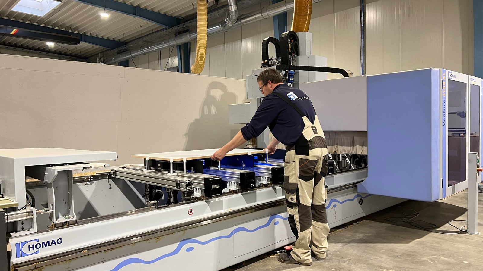 Ein anderer Ansatz ist es, mit Tischlerkollegen zu kooperieren. Er kann aufgrund seiner aktuell deutlich erweiterten technologischen Möglichkeiten mit Plattenbearbeitungen unterstützen – vom Zuschnitt über das Kantenanleimen bis hin zur CNC-Bearbeitung. Umgekehrt greift auch er gerne auf die Kompetenz von Tischlerkollegen in anderen Bereichen zurück, die nicht zum Kernportfolio seiner Tischlerei zählen.