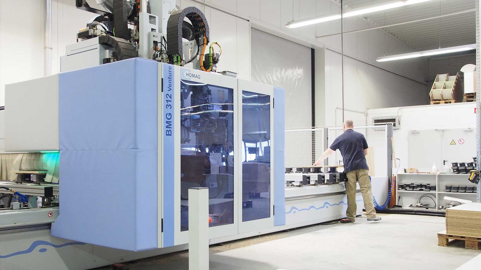 Vor rund zehn Jahren errichtete der Fertigungsspezialist eine neue Produktionshalle (4000 m²) sowie ein neues Bürogebäude. Im Zuge des Neubaus wurden fast alle Maschinen neu angeschafft. Darunter eine Säge-Lager-Kombination, zwei Kantenanleimmaschinen und ein CNC-Bearbeitungszentrum. Dabei setzten Andreas Watzinger und Andreas Balnuweit auf das Know-how und die Maschinentechnologie ihres langjährigen Technologiepartners HOMAG.
