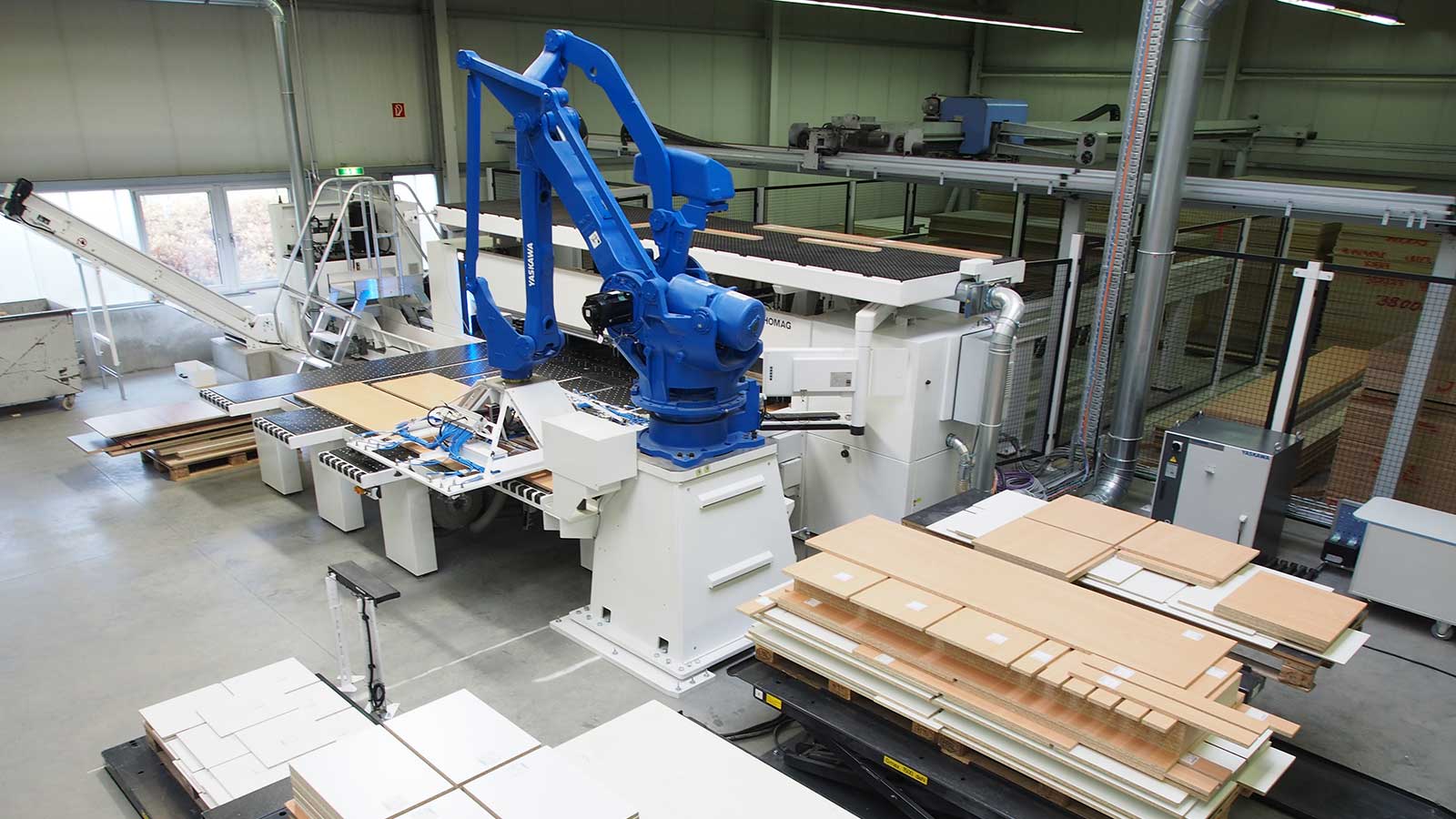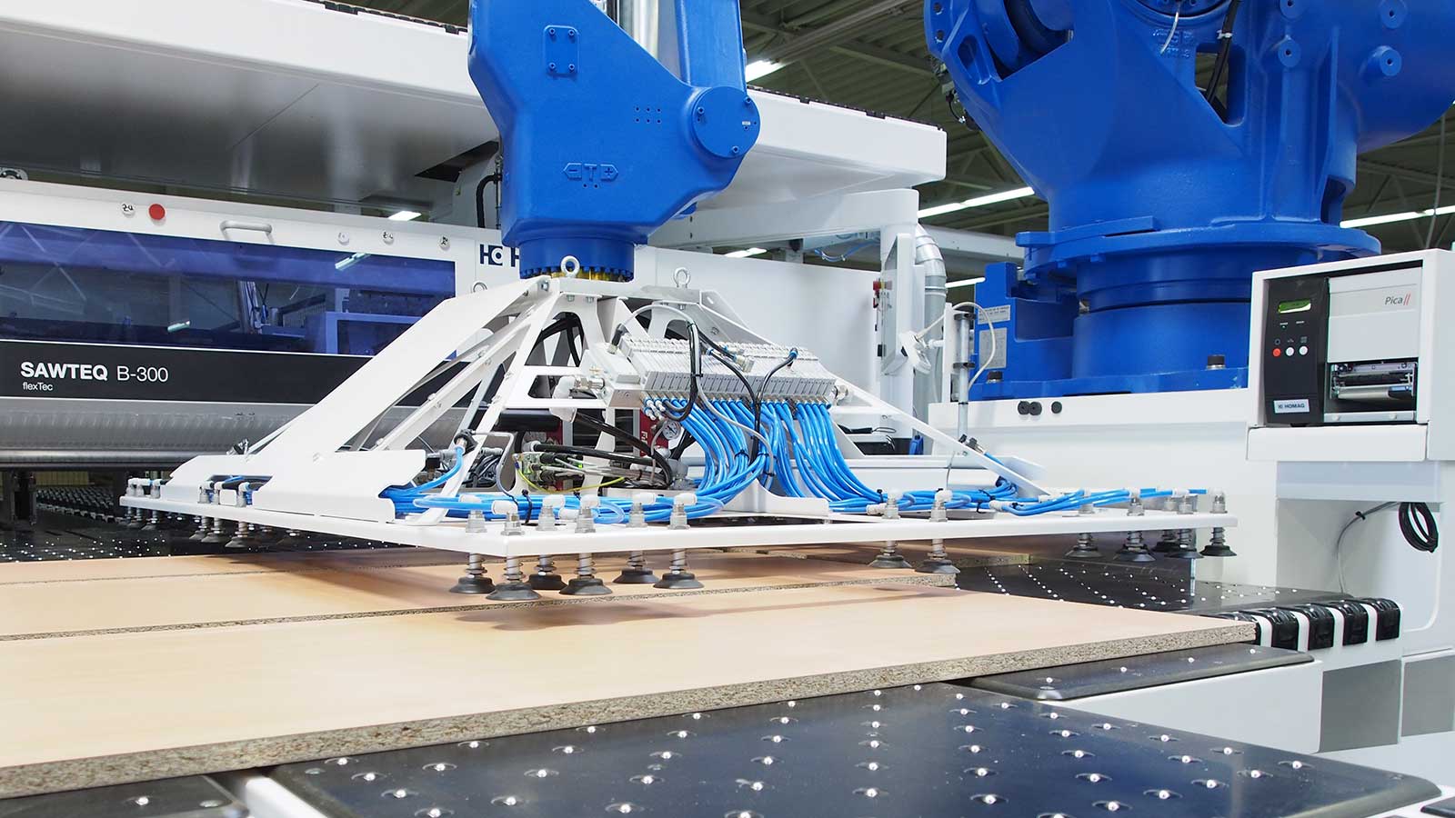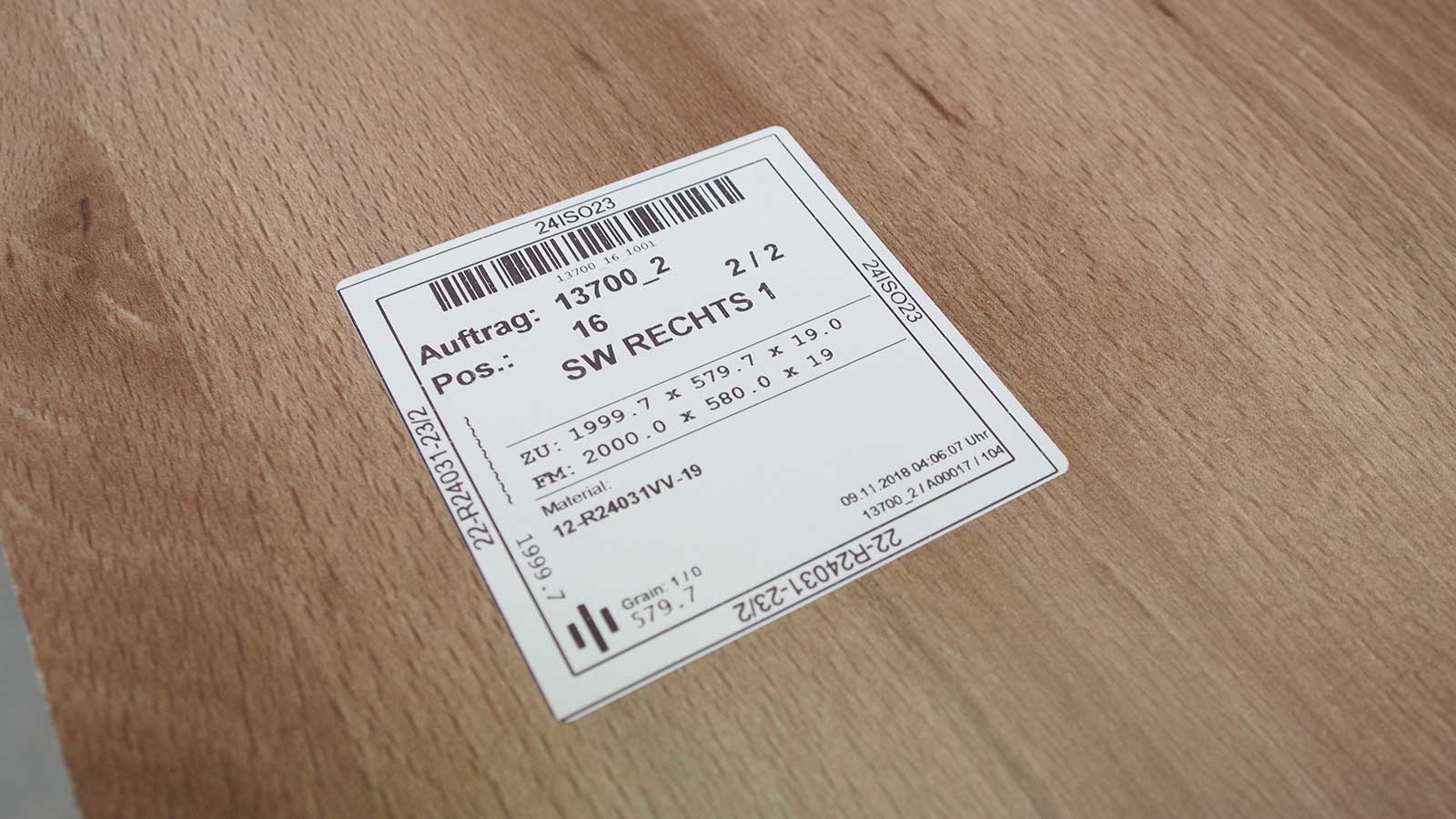 Im mannlosen Automatikbetrieb übernimmt ein Roboter mit Saugtraverse das komplette Materialhandling während des Sägeprozesses, nachdem dieses der Säge aus dem automatischen Plattenlager zugeführt wurde. Dabei ist es spektakulär anzusehen, wie der Roboter die Teile selbstständig zwischenpuffert, dreht und am Ende automatisch auf einem der fünf Abstabelplätze ablegt. Bemerkenswert, mit wie viel "Intelligenz" die HOMAG-Spezialisten das System ausgestattet haben. Die Etikettierung erfolgt natürlich vollautomatisch. Der Etikettierer befindet sich im Bereich des Druckbalkens.