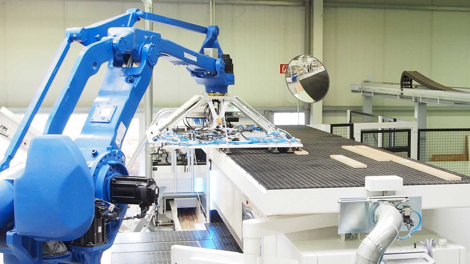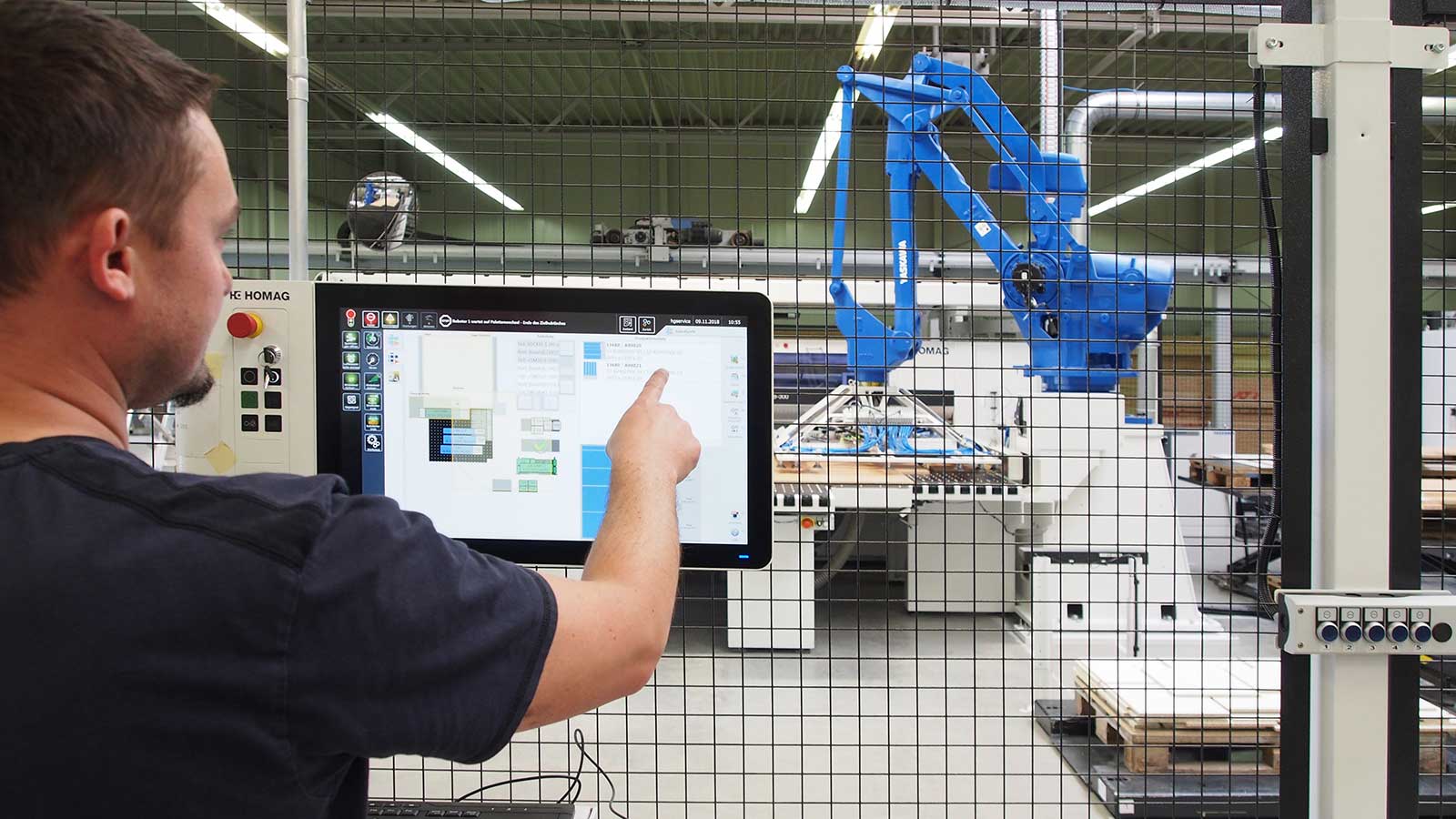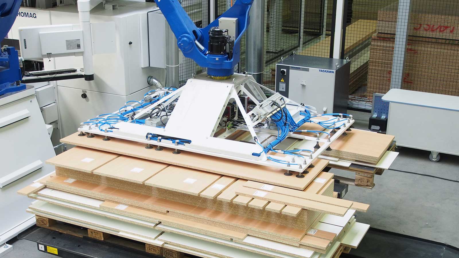 Im mannlosen Automatikbetrieb übernimmt ein Roboter mit Saugtraverse das komplette Materialhandling während des Sägeprozesses, nachdem dieses der Säge aus dem automatischen Plattenlager zugeführt wurde. Dabei ist es spektakulär anzusehen, wie der Roboter die Teile selbstständig zwischenpuffert, dreht und am Ende automatisch auf einem der fünf Abstabelplätze ablegt. Bemerkenswert, mit wie viel "Intelligenz" die HOMAG-Spezialisten das System ausgestattet haben. Die Etikettierung erfolgt natürlich vollautomatisch. Der Etikettierer befindet sich im Bereich des Druckbalkens.