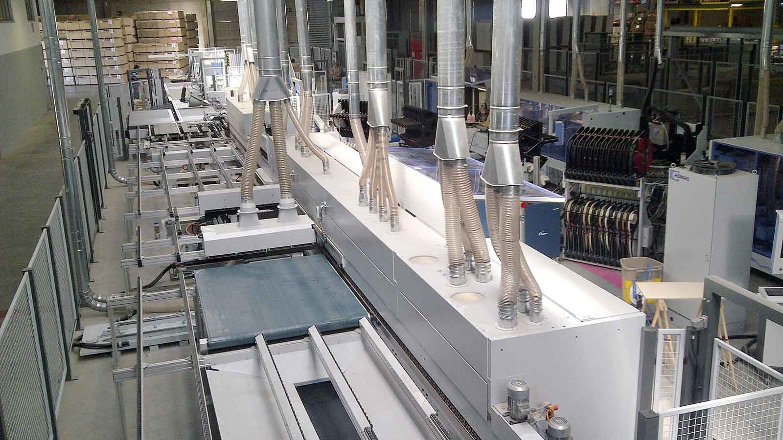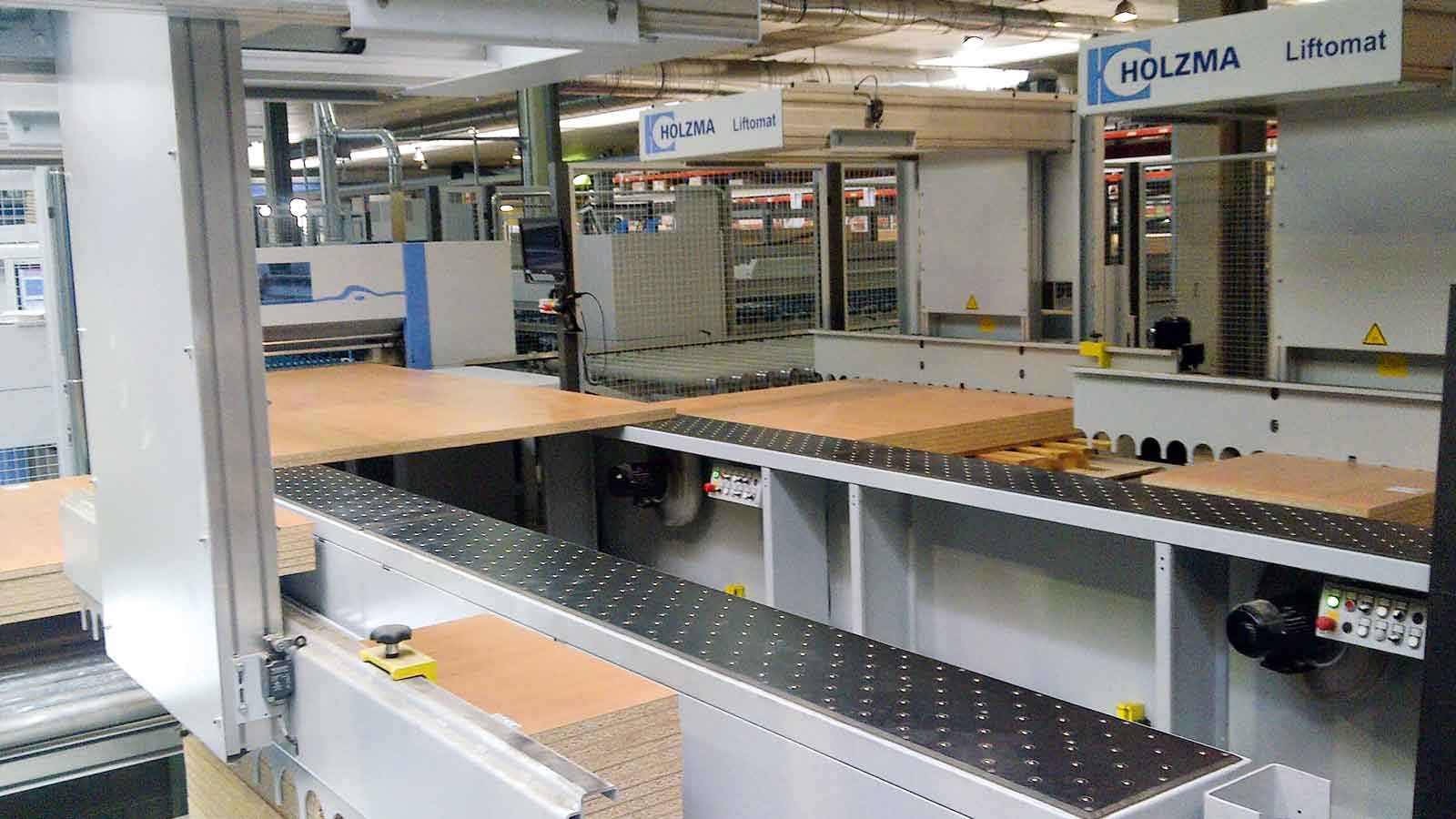 Die Anlage besteht zunächst aus einer Säge-Lager-Kombination mit automatischer Teileetikettierung. Diese ist entkoppelt durch einen Rollenbahnpuffer von der voll verketteten Anlage bestehend aus zwei Kantenanleimmaschinen (O- und U-Betrieb möglich), einem Vertikalspeicher und zwei hochflexiblen Durchlaufbohrmaschinen. Die Kantenlinie kann konventionell mit PUR-Kleber oder mit Lasertechnik betrieben werden.
