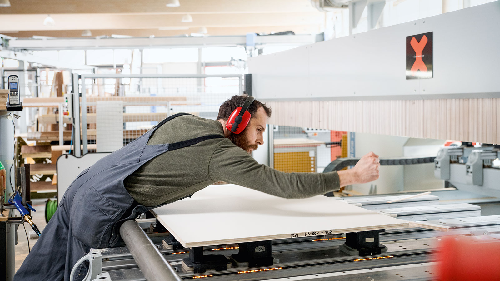 Wie von Geisterhand gesteuert, fährt hier ein Greifer unterhalb der Hallendecke umher, senkt sich herab, sucht vollautomatisch die richtige Holzplatte heraus und führt sie der Säge zu. Die zugeschnittenen Teile werden vom Steuerungssystem mit einem Barcode versehen, der alle Daten und Informationen enthält, die für das weitere Bohren, Fräsen oder Bearbeiten der Kanten notwendig sind. Das macht die Produktion und die Logistik transparent und effizient. „Alle Maschinen werden Stück für Stück und vollkommen miteinander vernetzt“, erklärt Josef Fitz. „Dieses Jahr noch werden wir damit fertig sein. Dann können wir digital verfolgen, wo welches Teil ist.“
