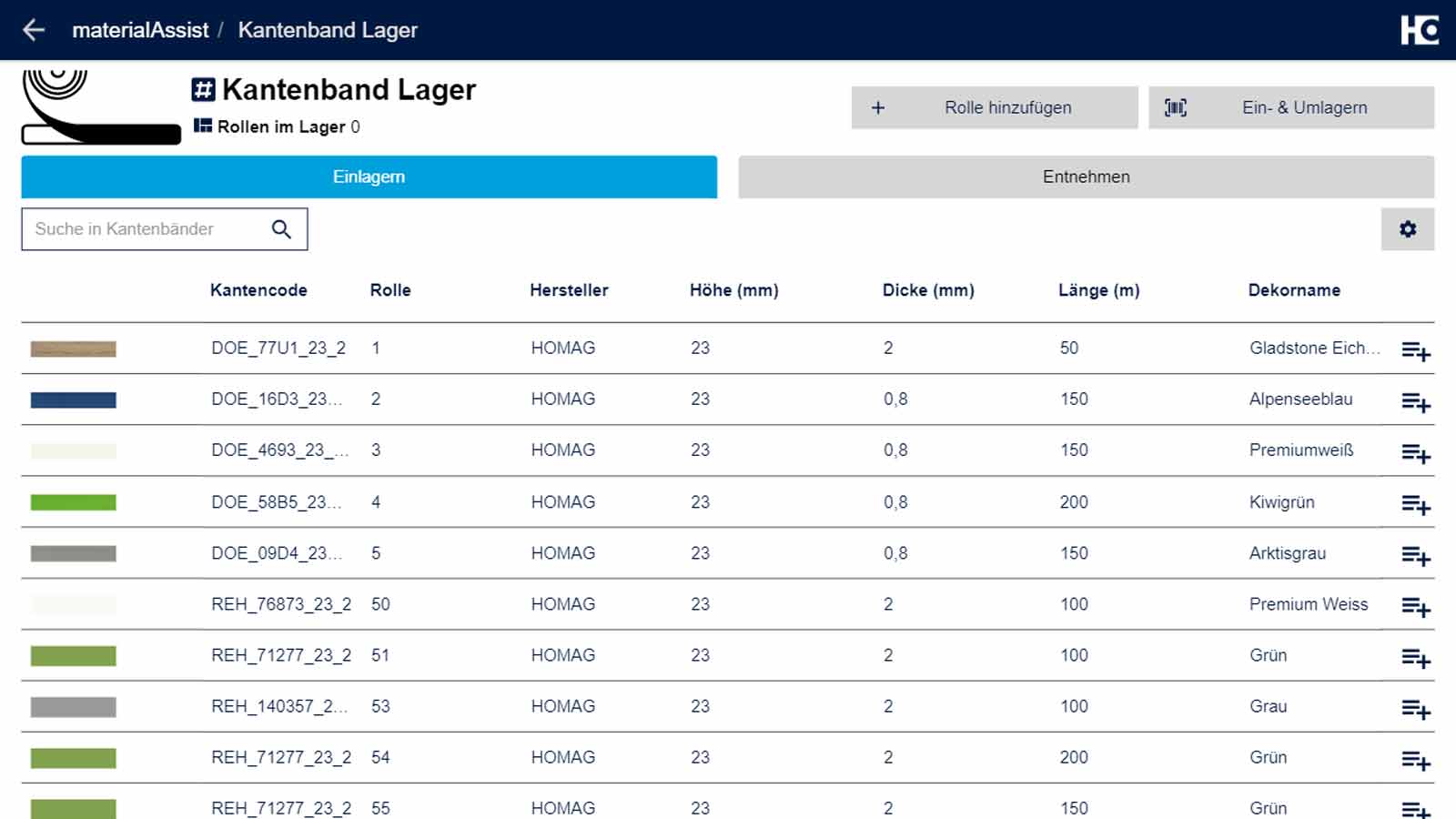 Abhilfe schafft jetzt das »Kantenbandmanagement«-Set von Homag. Es besteht aus den online über tapio erhältlichen Apps »Materialmanager«, und »Materialassist«, selbstgebauten