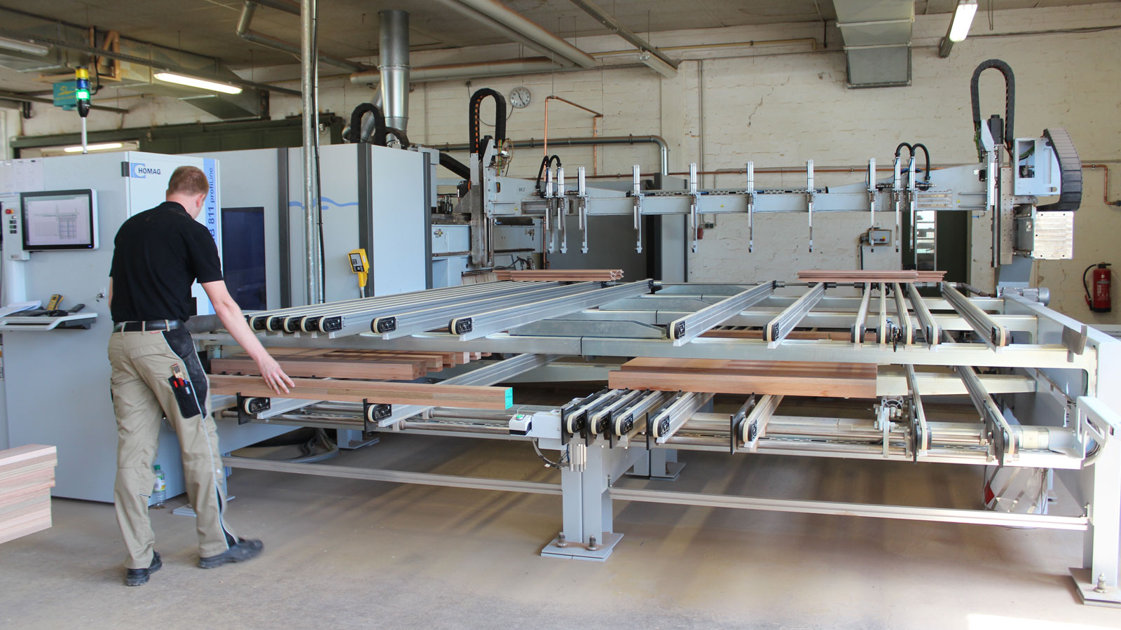 Vor rund zwei Jahren hat das Unternehmen kräftig in die Fensterfertigung investiert. Jürgen Diekmann erklärt: „Mit unserer eher unflexiblen Winkelanlage konnten wir sowohl die technischen Anforderungen als auch die hohen Kundenansprüche und die wachsende Produktvielfalt kaum noch erfüllen.“ Hinzu kam der Wandel in der Fertigungstechnologie, die ganz neue Möglichkeiten eröffnete. Mit der Entscheidung für flexible CNC-Komplettbearbeitung und die Investition in ein CNC-Bearbeitungszentrum CENTATEQ S-800 (ehemalige Bezeichnung: powerProfiler BMB 811) von HOMAG mit einer Kapazität von rund 20 Fenstern/Tag wurde die Bauelementefertigung auf eine neue, zukunftsfähige Basis gestellt. Die bisher eingesetzte Schlitz-Zapfeneck-Verbindung mit schweren Werkzeugsätzen war damit aus dem Rennen.
