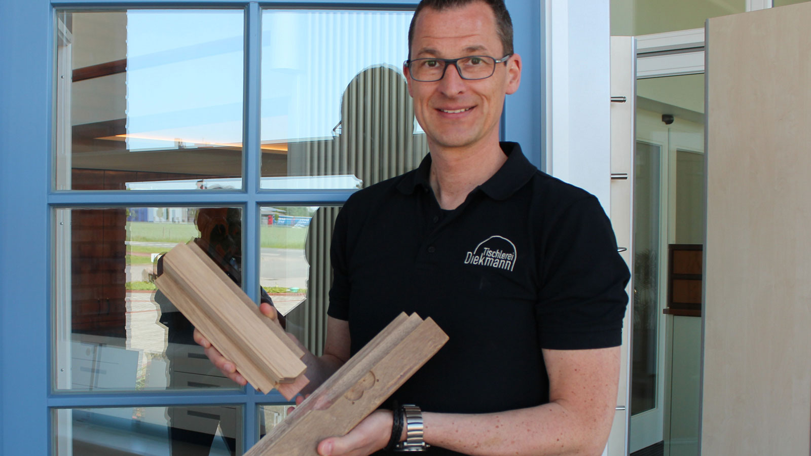 Zwischen der attraktiven Präsentation von Holzfenstern, Haustüren, Möbeln und Küchen im neuen Showroom wird schnell klar: „Wir sind als Vollsortimenter mit allen Tischlerleistungen aktiv“, erklärt Jürgen Diekmann. Der Tischler und Architekt führt den Familienbetrieb in zweiter Generation und sieht keinen Anlass am Firmenprofil zu rütteln. Ganz im Gegenteil: „Der Fenster- und Innenausbau profitieren voneinander. Wir wollen gerade unser universelles Firmenkonzept offensiv ausbauen.“ Mit derzeit 30 Mitarbeitern produziert die Tischlerei Diekmann Fenster, Hebe-Schiebetüren, Haustüren und Wintergärten aus Holz und Holz-Alu sowie das gesamte Spektrum des individuellen Möbel- und Innenausbaus in bester Qualität. Beide Bereiche stellen jeweils rund die Hälfte des Umsatzes, der zu je einem Drittel von Privatkunden, Architekten und Firmenkunden stammt. Im Bauelementebereich punktet Diekmann mit konstruktiver Kompetenz und flächenbündigen Holz-Alu-Systemen vor allem im Objektbereich. Im Innenausbau sind individuelle Kücheneinrichtungen eine besondere Stärke der Tischlerei in der wirtschaftlich aufstrebenden Region Vechta.