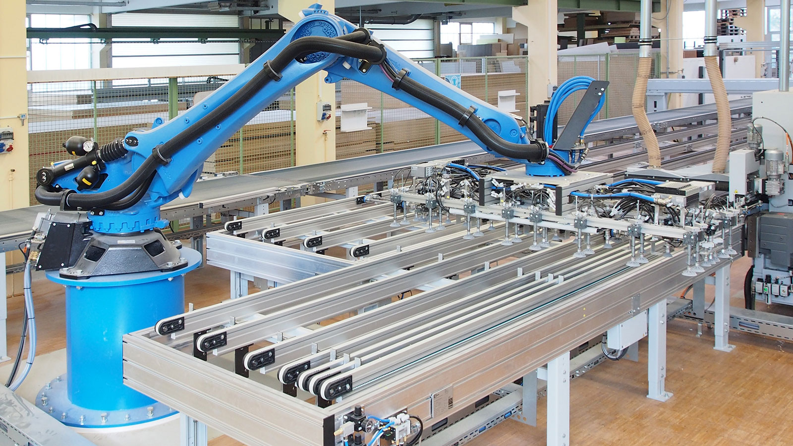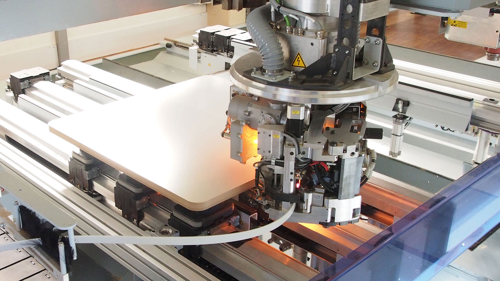 Auch der Wechsel von Laser auf Schmelzkleber und umgekehrt erfolgt „fliegend“ von einem Teil zum anderen, ohne dass der Maschinenbediener in irgendeiner Weise eingreifen muss. Die Anlage weiß also ganz genau, wie jedes einzelne Teil zu bearbeiten ist. Bedient wird sie von nur einem Mitarbeiter. Am hinteren Ende der Maschine übergibt ein Roboter wahlweise an die Teilerückführung für weitere Kantenbearbeitungen oder aber er stapelt die fertigen Teile ab.