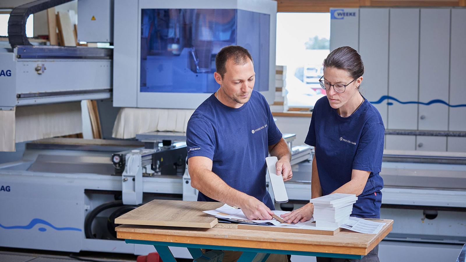 Am darauffolgenden Montag kündigt seine Begleitung und fängt in Aham an. Als die Maschine dann ankommt, fällt der HOMAG-Monteur erst mal aus allen Wolken. Neumaschine gekauft – ohne Schulung. Ein absolutes No-Go, aber Josef Eibl ist sich sicher, dass er den CNC-Fachmann ja bereits im Haus hat. Und so ist es auch. Kurzerhand fräst der eine Haustürzarge in Segmentbogenform – laut dem Monteur eigentlich außerhalb des Maschinenmöglichen. Der Monteur ist begeistert, Josef Eibl ebenfalls. Geändert hat sich daran wenig. Heute noch gerät der niederbayerische Schreinermeister ins Schwärmen, wenn er darüber spricht, wie er mit der CNC Verzinkungen hinbekommt, die so exakt sind, dass es Rillen braucht, um überhaupt Leim dazwischen zu bekommen. Oder dass seine Mitarbeiter versteckte Kabelkanäle für integrierte Beleuchtungskonzepte in Holztische fräsen.