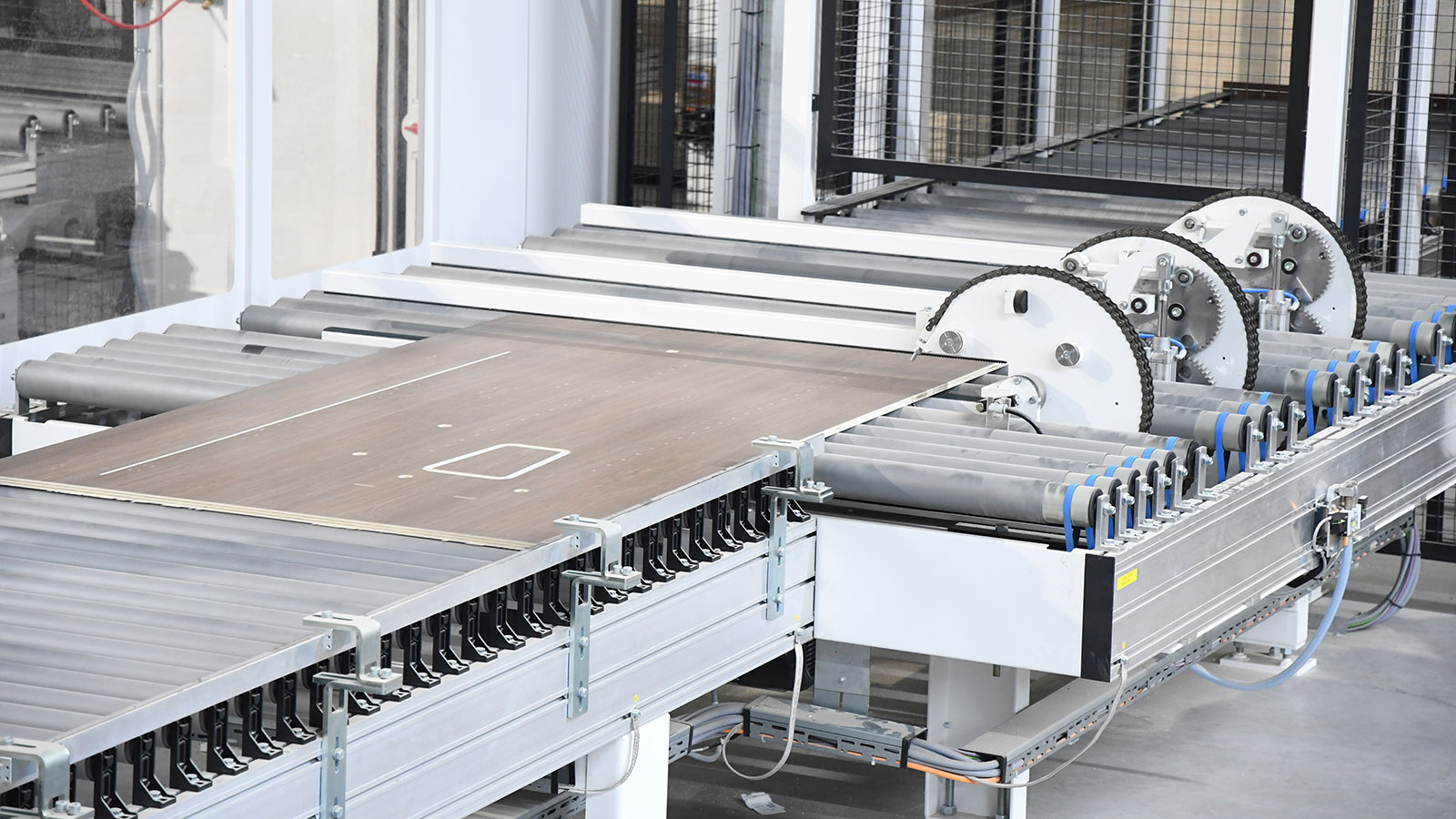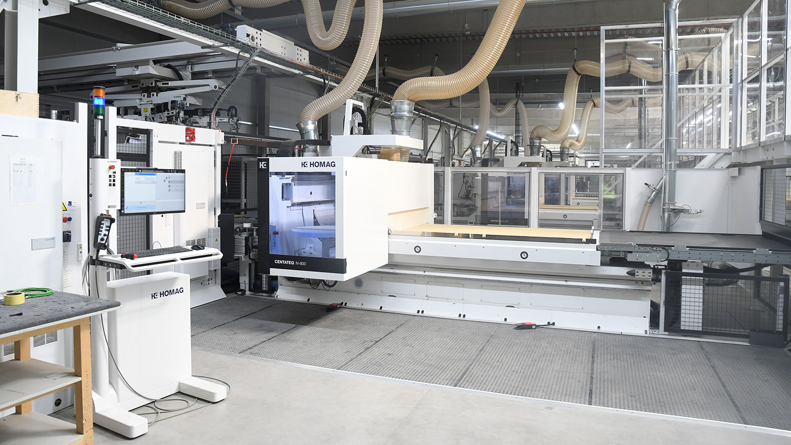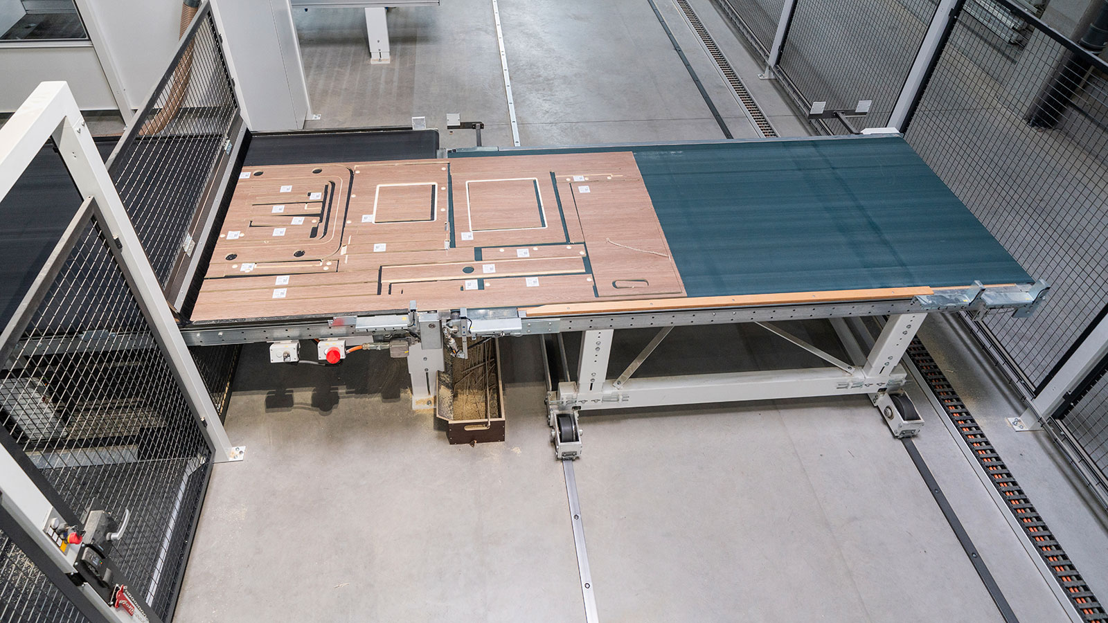 „Ist eine beidseitige Bearbeitung gefordert, läuft die bereits bearbeitete Platte vom Quertransport über einen Plattenwender (zurück ins Plattenlager und automatisch erneut in eine CENTATEQ N ein, wo dann die restlichen Bearbeitungen und das finale aufteilen stattfindet.“ Aktuell betrifft dies circa 75 % der Platten. Bei einseitiger Bearbeitung wird das Nest direkt zum Auslauf in die Handentnahme transportiert. Damit die drei CENTATEQs möglichst durchgängig in Betrieb sind, gibt es verschiedene Pufferplätze, zum Beispiel bei der Etikettierung oder vor dem Querverschiebewagen.