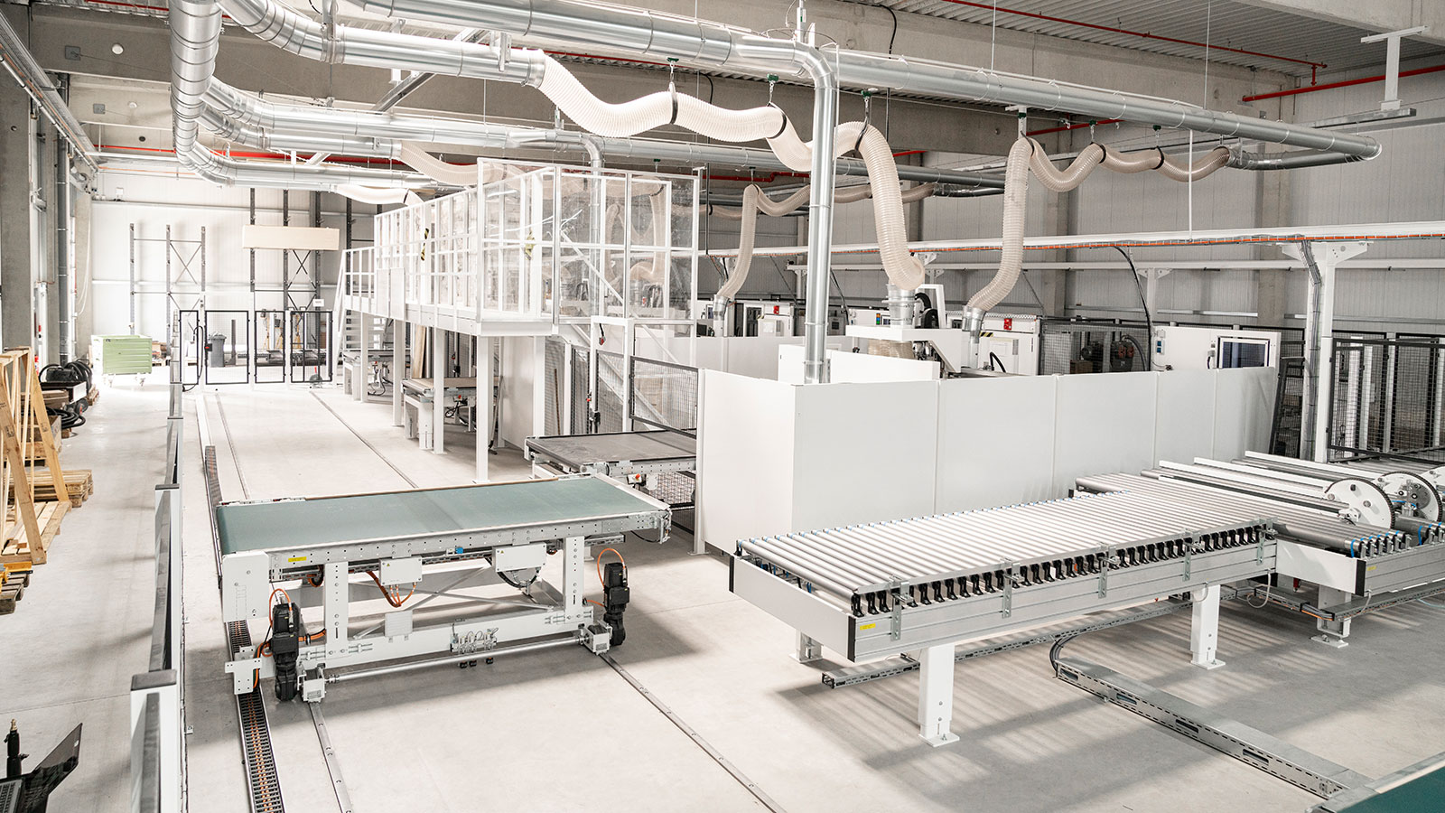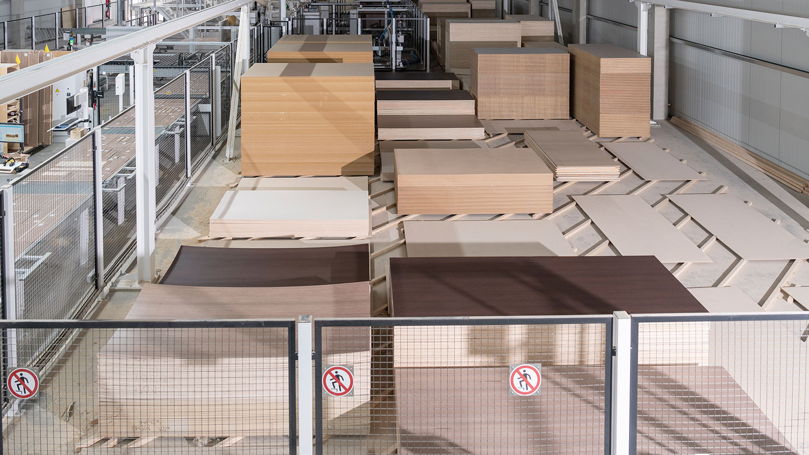 Der Zuschnitt einschließlich Lagerung, Handling und Kommissionierung erfolgt heute in einem hochautomatisierten, mannarmen Prozess. Nach Anlieferung werden die Sperrholzplatten in Kragarmregalen gelagert, um bei Bedarf auf eine von drei Rollenbahnen gesetzt zu werden. Bis zu sechs Stapel lassen sich hier für die sichere Versorgung eines Flächenlagers STORETEQ P-500 puffern. Nach dem Fördern zum Lager übernimmt eine Doppelhubschere das automatische Einlagern der Platten. Für eine vorausschauende Einlagerung können am Abend auch Stapel bereitgestellt werden, da sortenrein ein- und folglich nicht umgelagert wird. Weil das STORETEQ P-500 zudem als Lager für die gesamte Produktion fungiert, verfügt es über zwei weitere Auslagerplätze für vorkommissionierte Stapel, die dann zu den Folgebearbeitungen laufen.